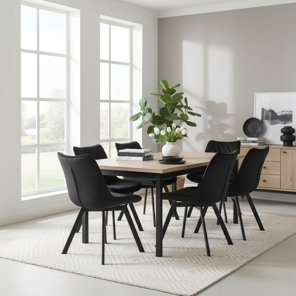 Sedadlo je čalouněné hebkou látkou s kosočtvercovým vzorem na opěradle. Tento vkusný designový prvek ozvláštňuje jinak minimalistický vzhled židle.