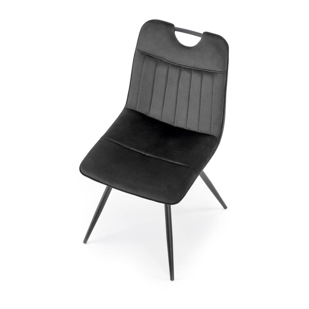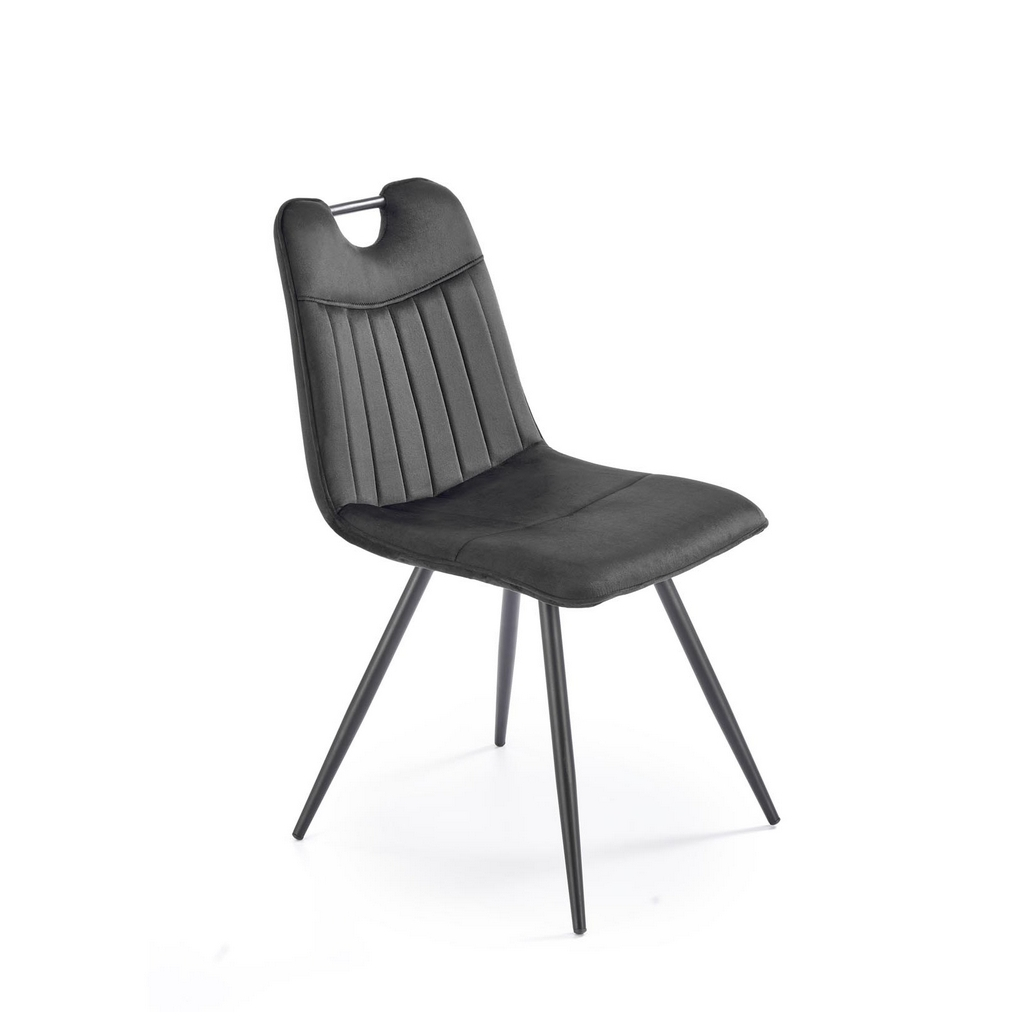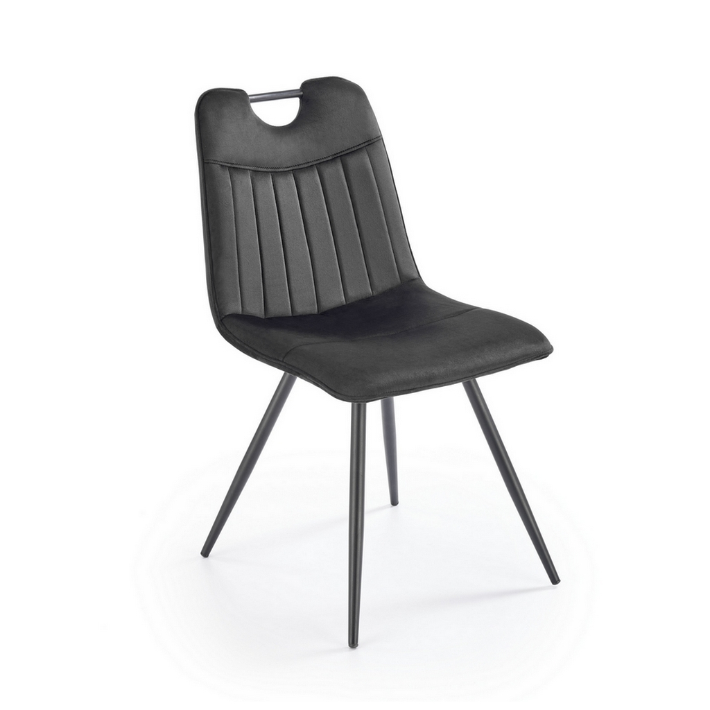 Sedadlo je čalouněné hebkou látkou s dekorativním vzorem na opěradle. Část výztuhy opěradla je bez čalounění a slouží jako madlo, díky kterému židli kdykoli snadno přemístíte.