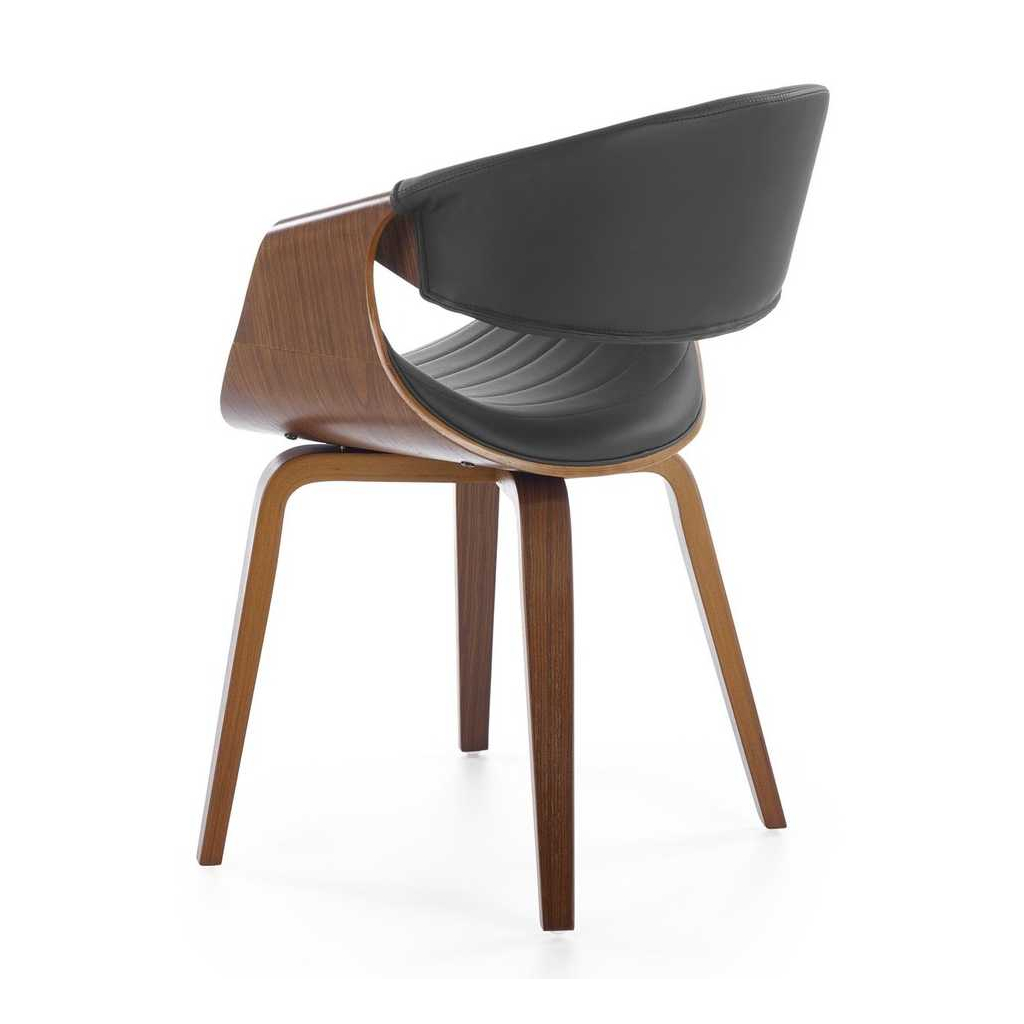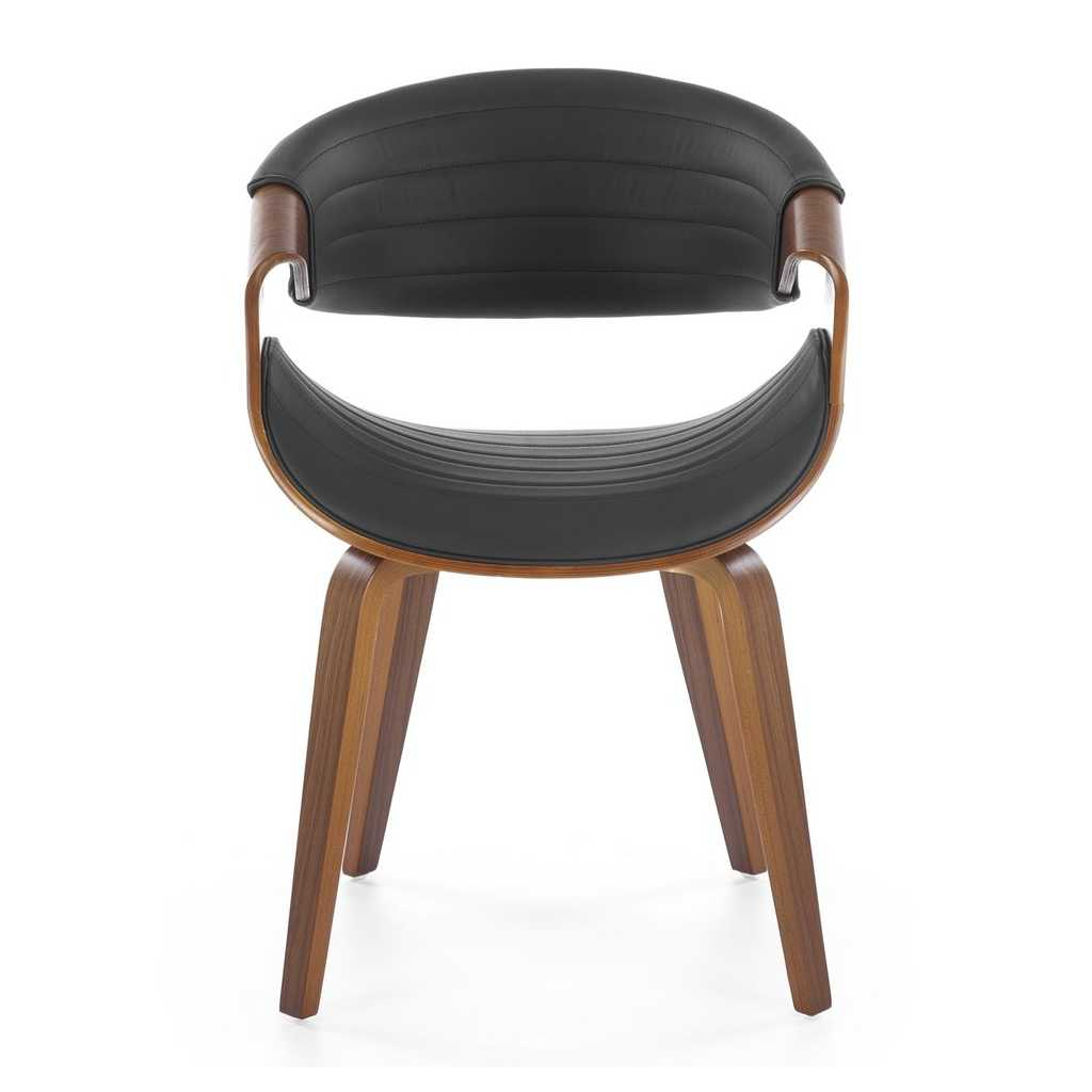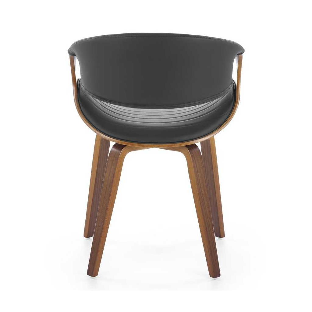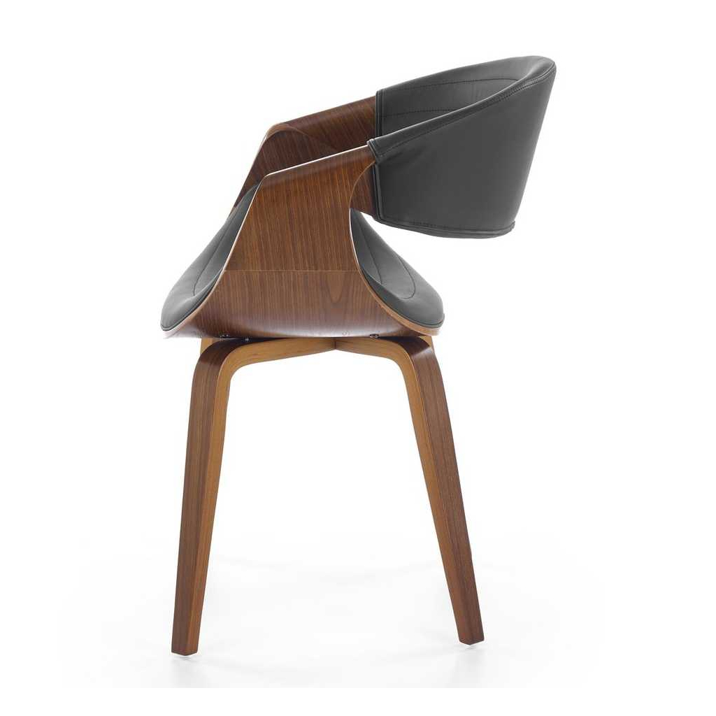 Židle stojí na 4 nohách z ohýbané překližky v tmavém dezénu ořechu, který židli dodává reprezentativní vzhled. Ten dále podtrhuje koženkový potah, který najdete na sedáku a opěradle.
