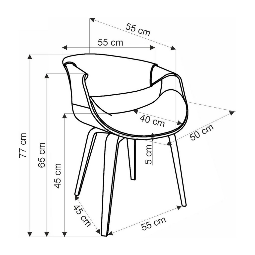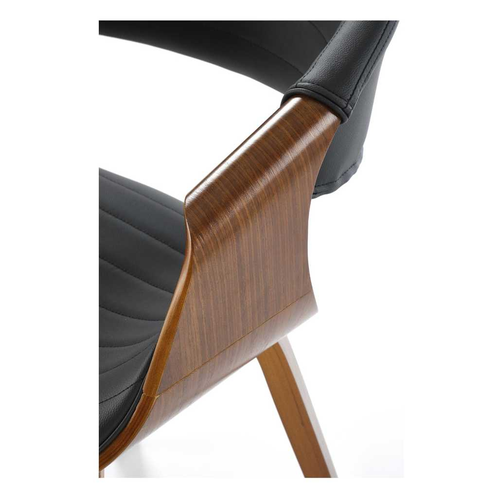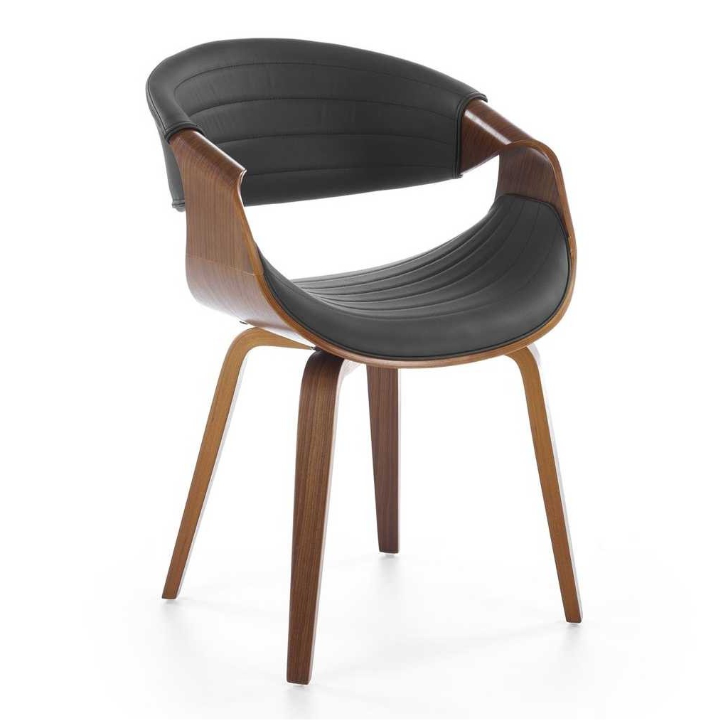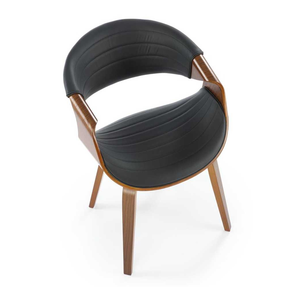 Židle stojí na 4 nohách z ohýbané překližky v tmavém dezénu ořechu, který židli dodává reprezentativní vzhled. Ten dále podtrhuje koženkový potah, který najdete na sedáku a opěradle.