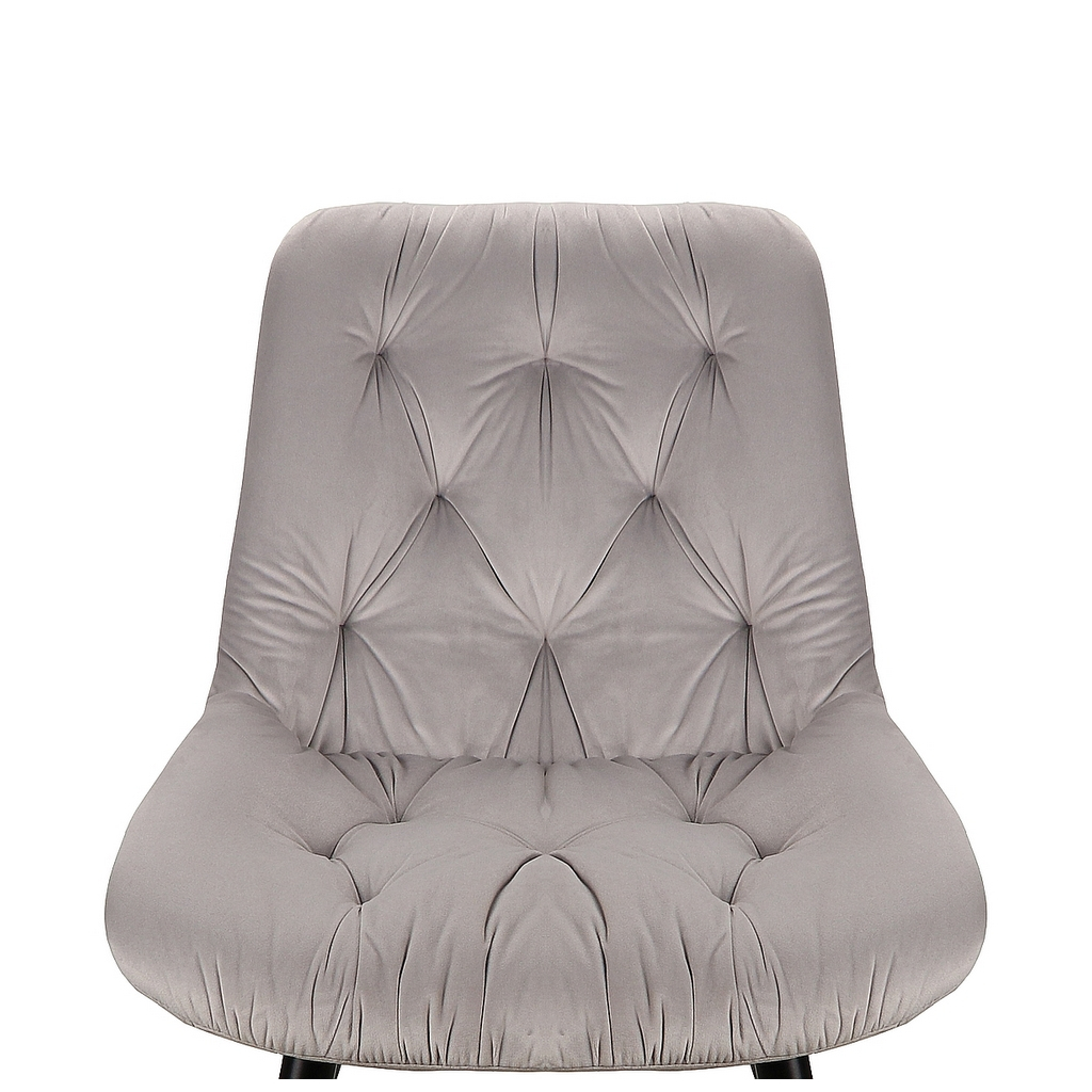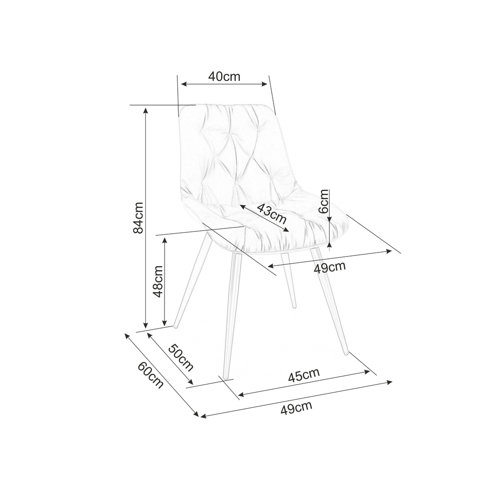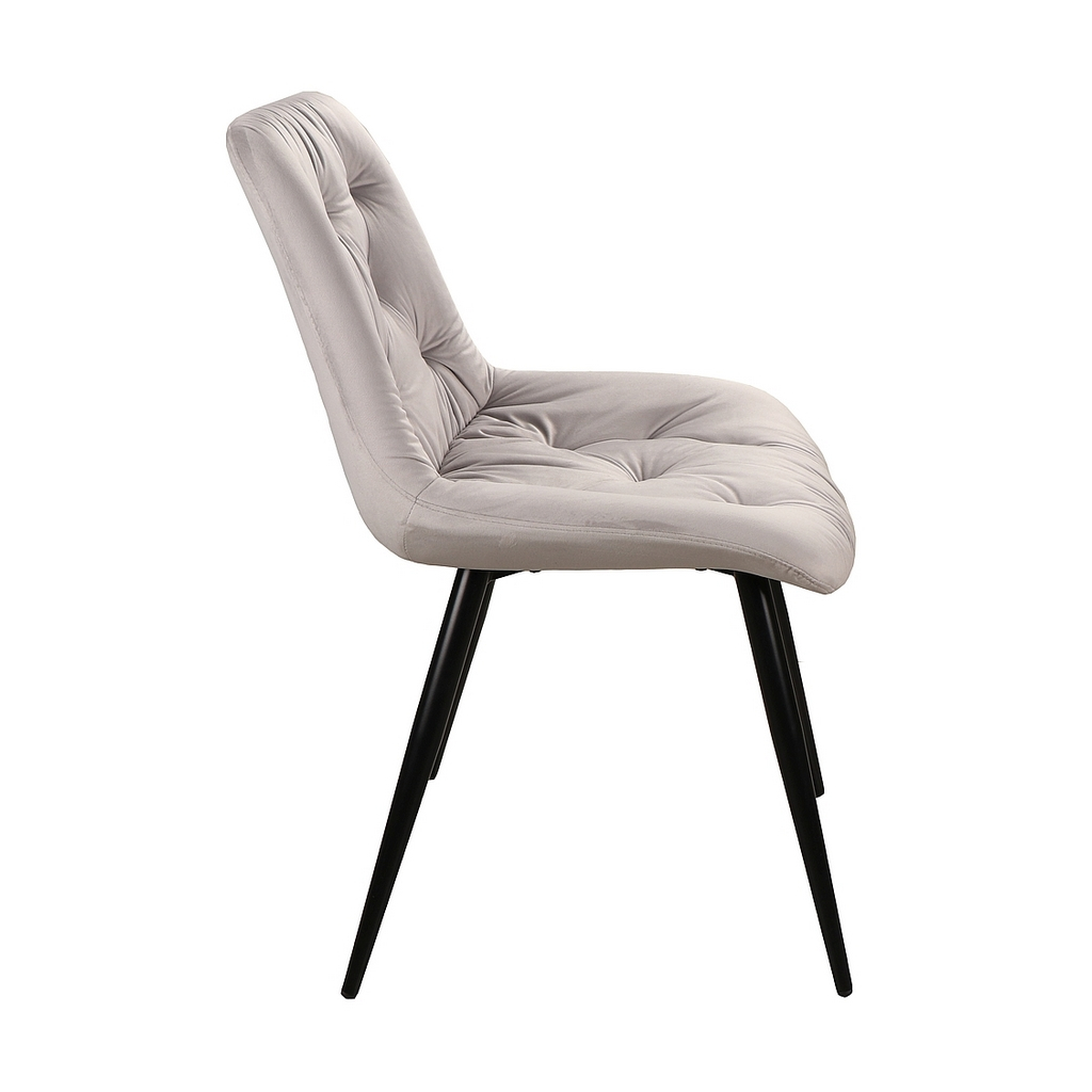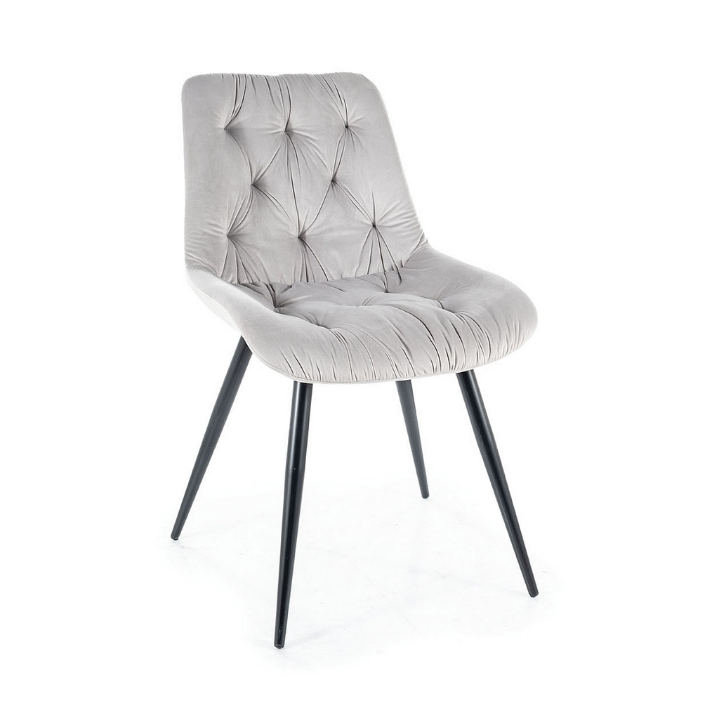 Židle kombinuje hebký látkový potah s prošíváním a úzké kovové nohy. Lehké vyvýšení sedáku na stranách poskytuje podporu bokům a posiluje komfort sezení.