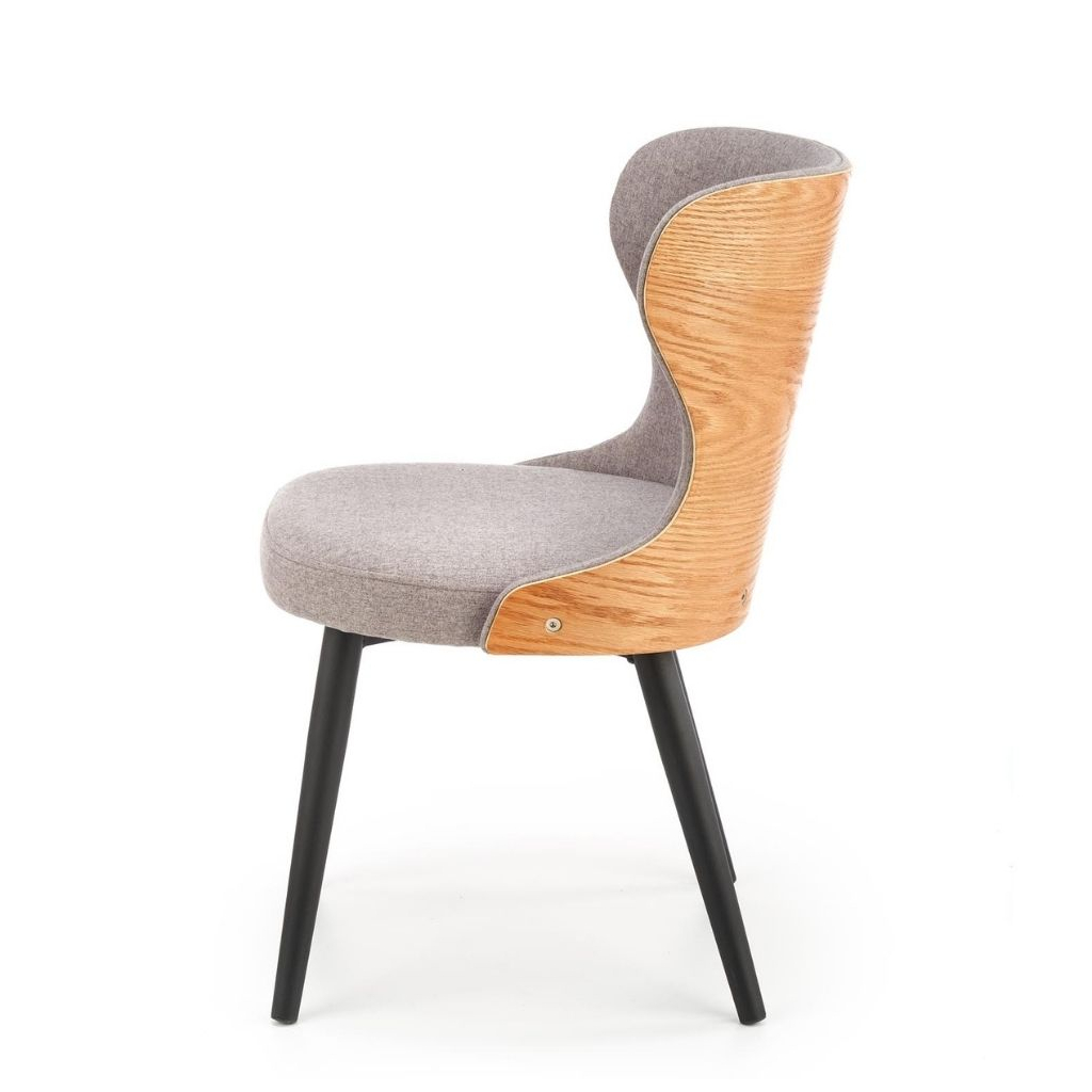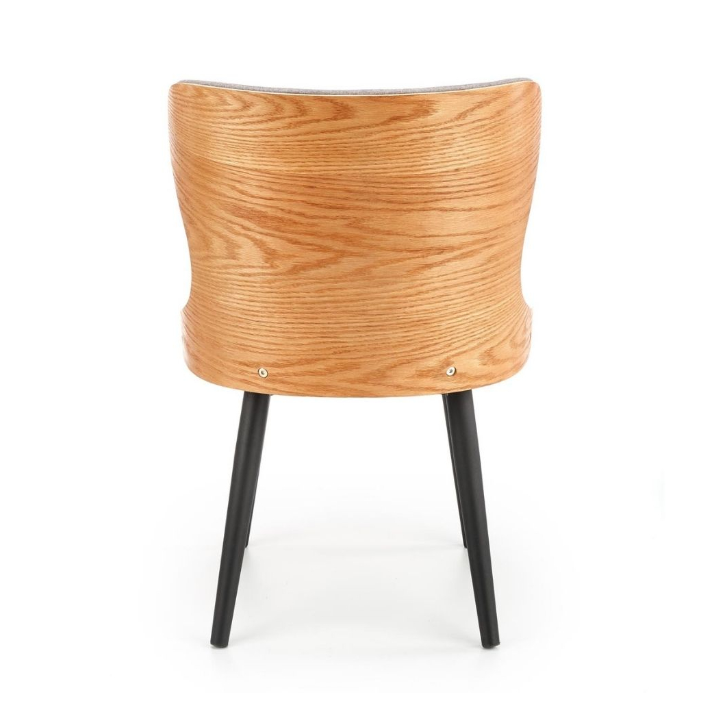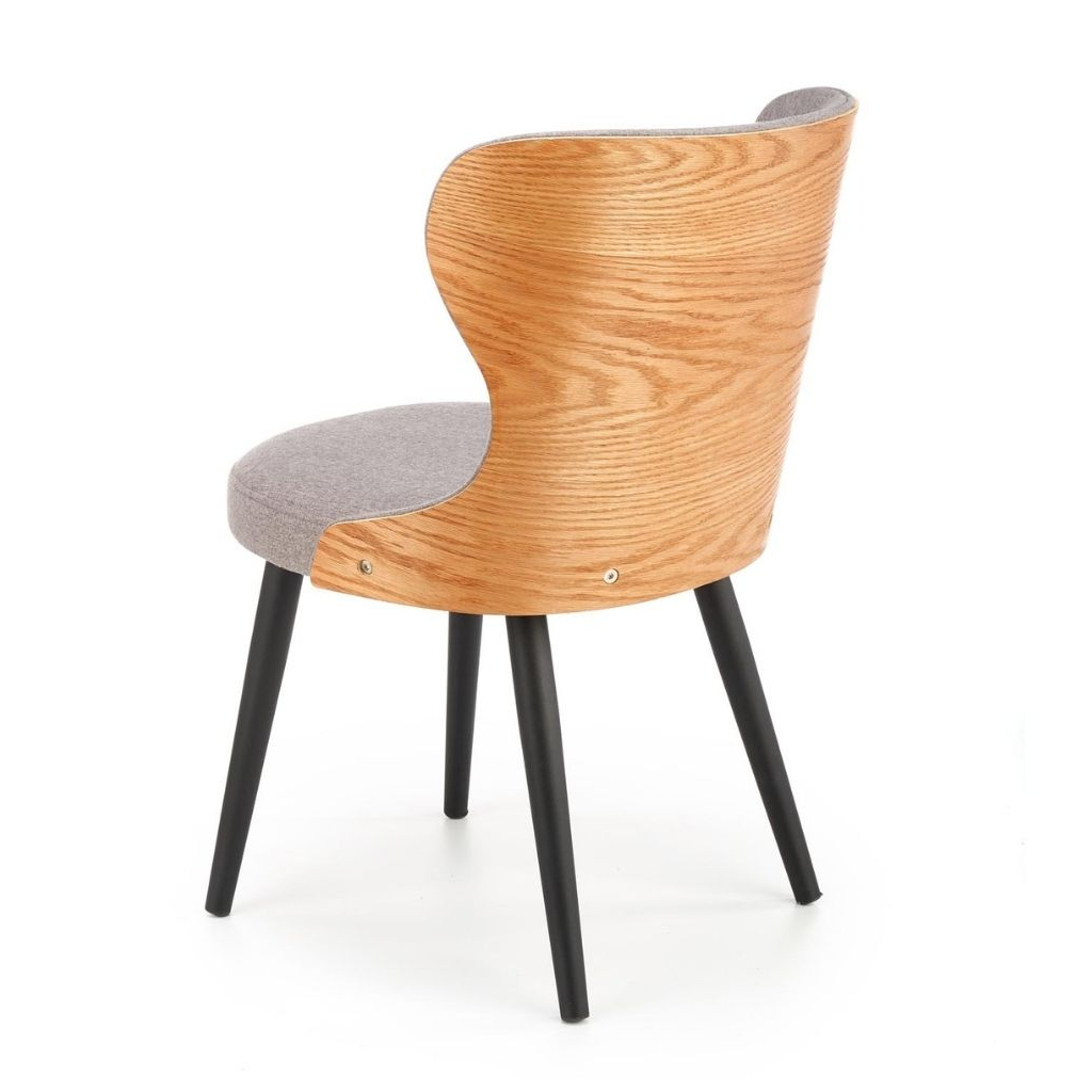 Její elegantní vzhled dotváří šedivý potah z odolné tkaniny, která je velmi příjemná na omak. V zadní části je opěrák doplněn pevným materiálem z kombinace ohýbané překližky a přírodní dýhy. Rázem tak jídelní židle vynikne i v přírodně laděných interiérech.