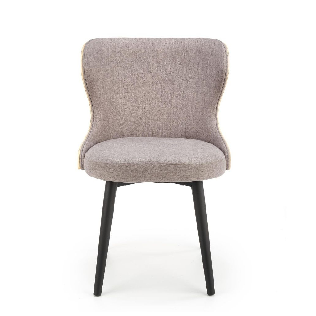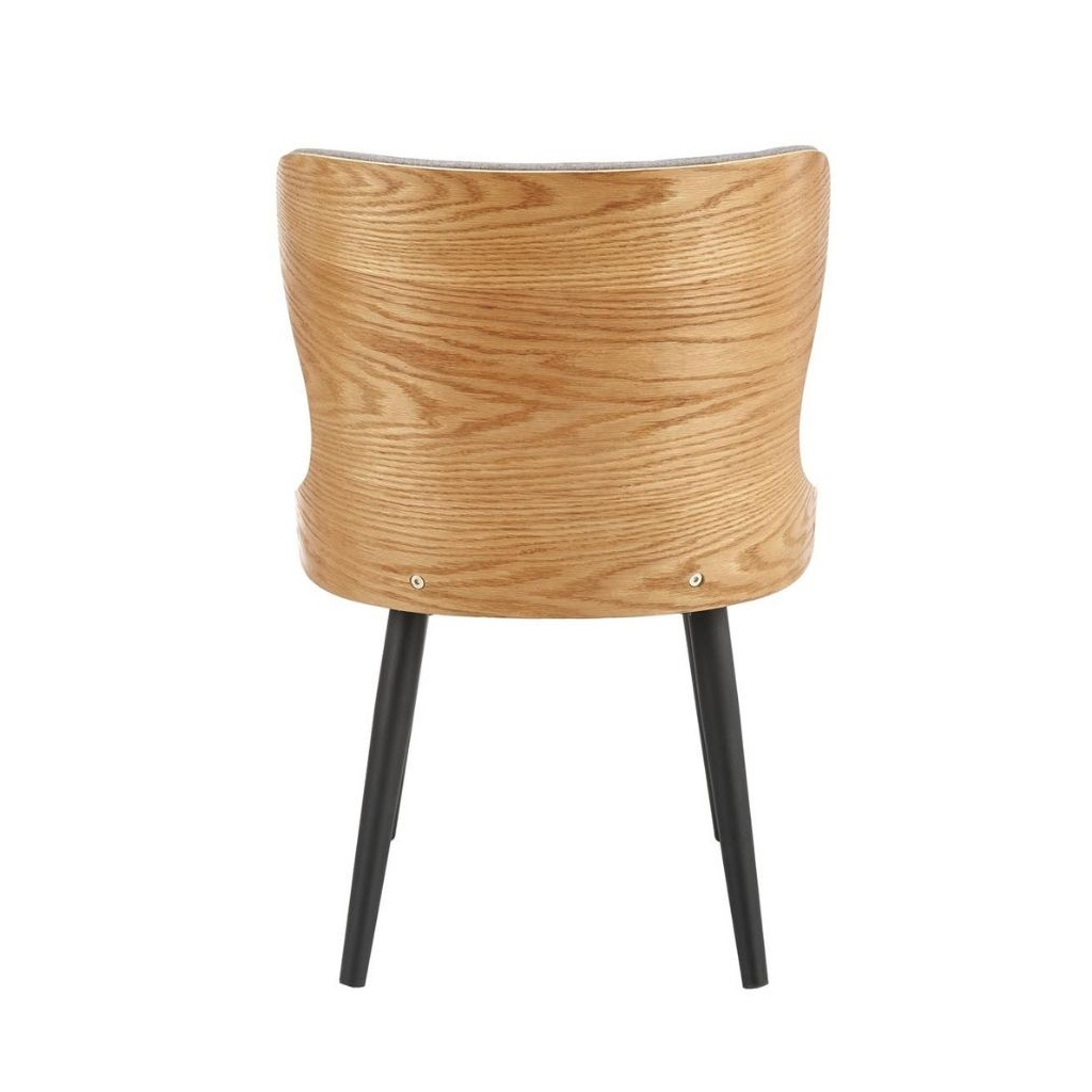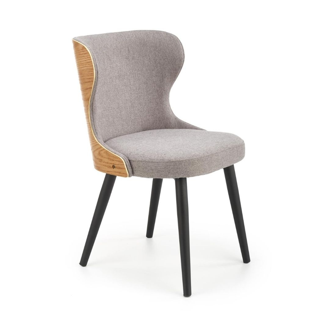 Její elegantní vzhled dotváří šedivý potah z odolné tkaniny, která je velmi příjemná na omak. V zadní části je opěrák doplněn pevným materiálem z kombinace ohýbané překližky a přírodní dýhy. Rázem tak jídelní židle vynikne i v přírodně laděných interiérech.