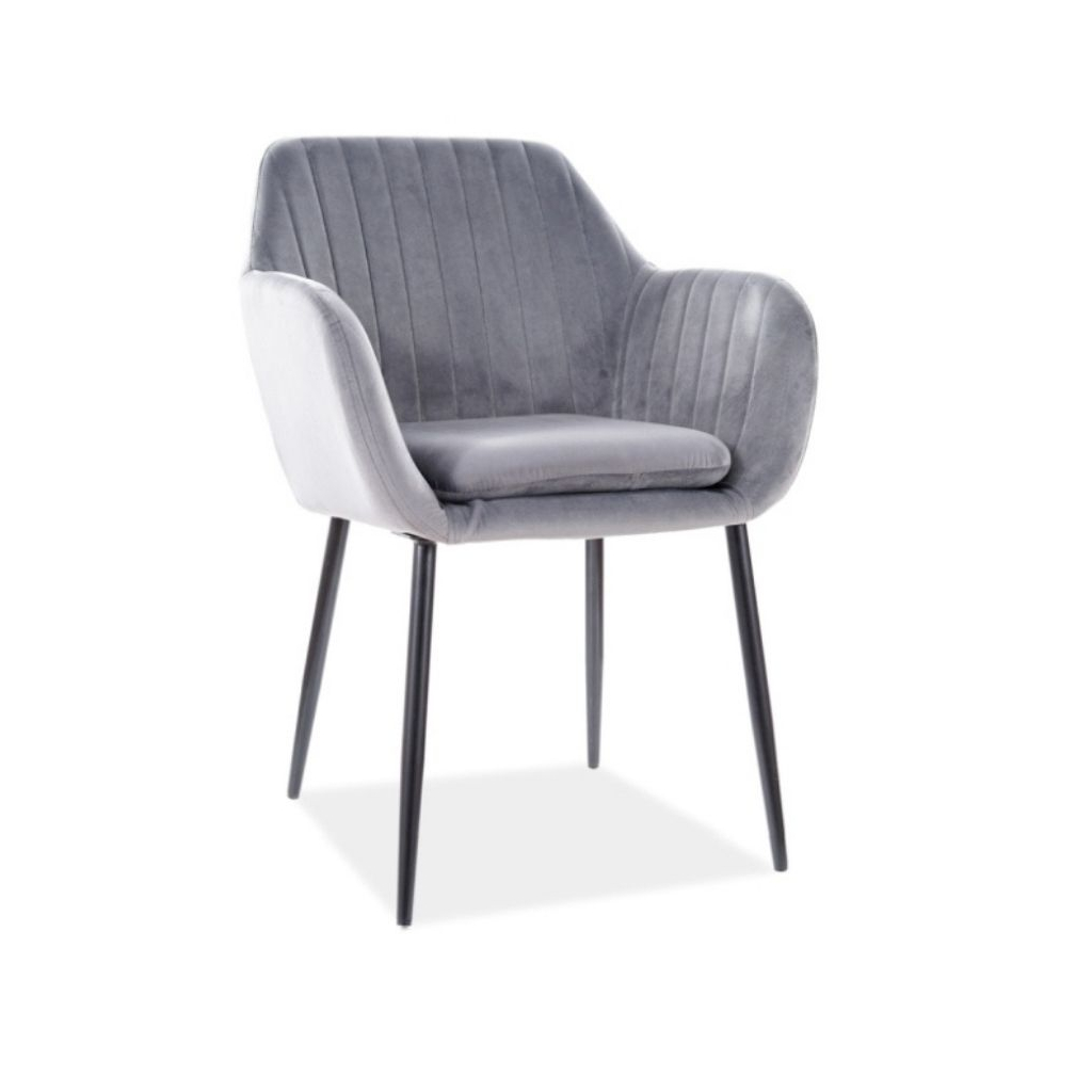 Jídelní židle Wenus Velvet nabízí příjemné a pohodlné posezení, neboť je celá potažená látkou a podsedák, opěrky rukou i zad jsou polstrované. Z vnitřní strany židle je navíc efektní prošití. Nohy jsou kovové v černé barvě.