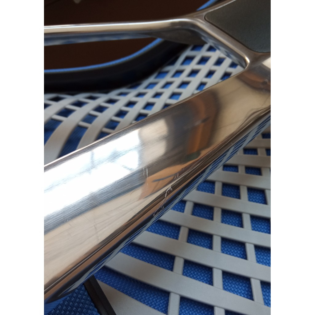 Chromovaná část opěradla má drobné oděrky (viz fotogalerie), jinak je židle v pořádku.