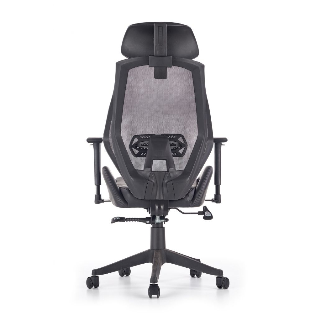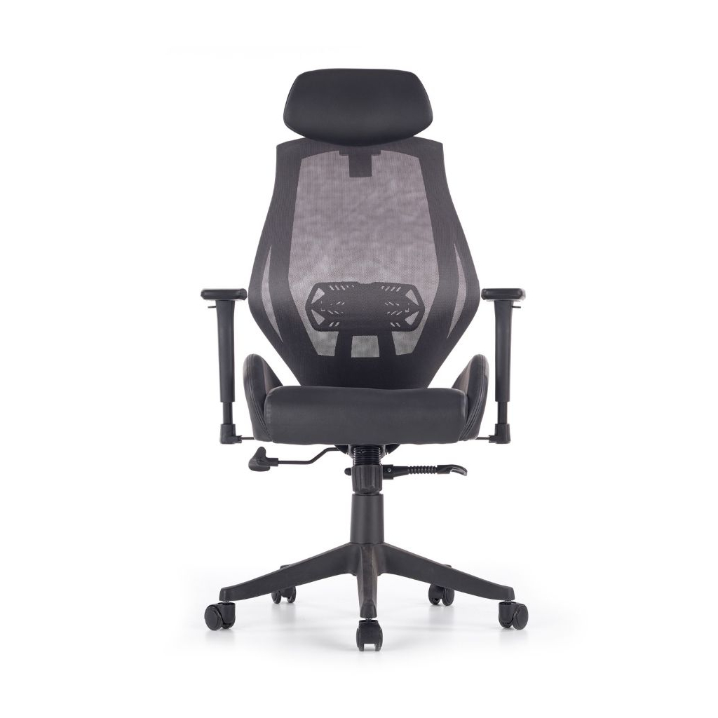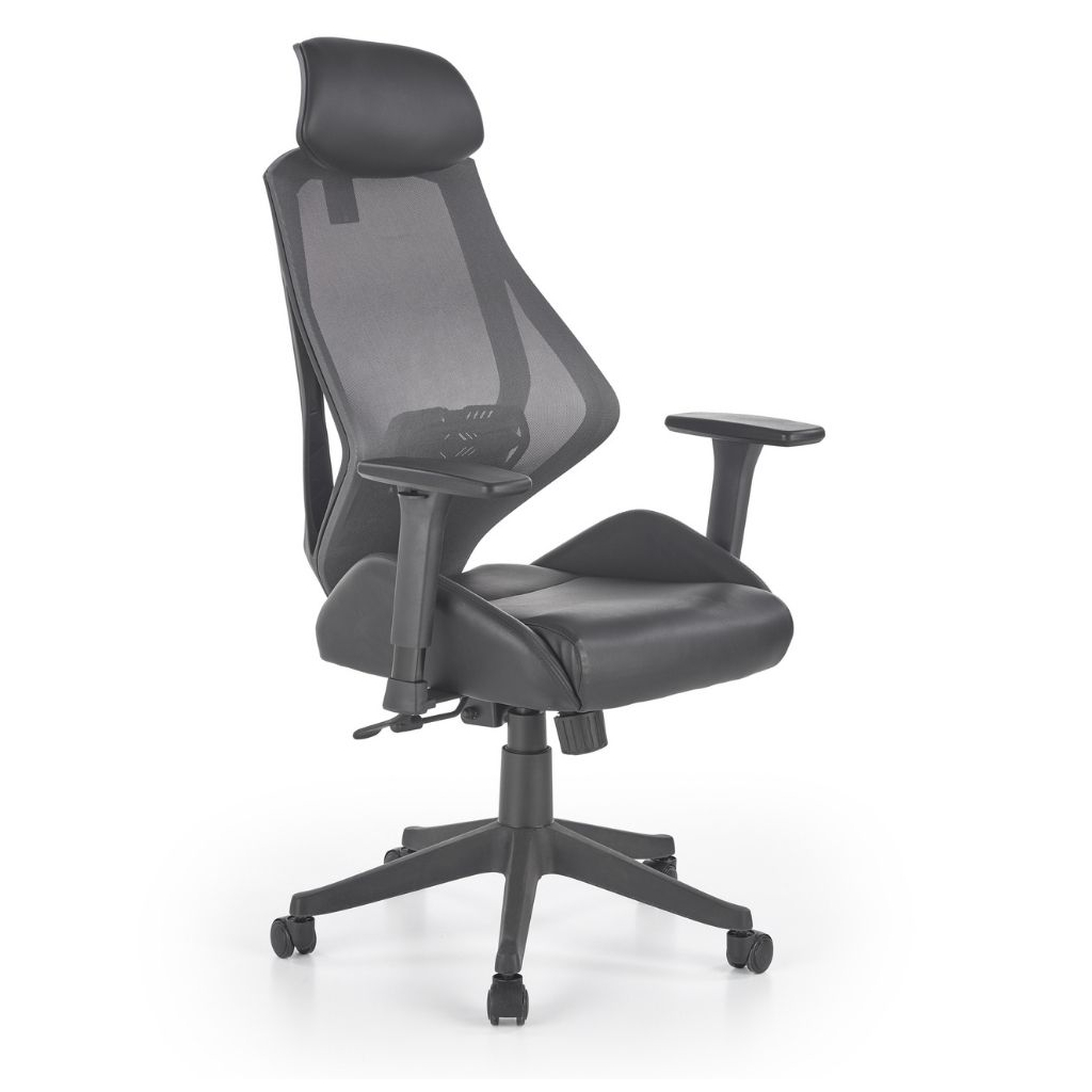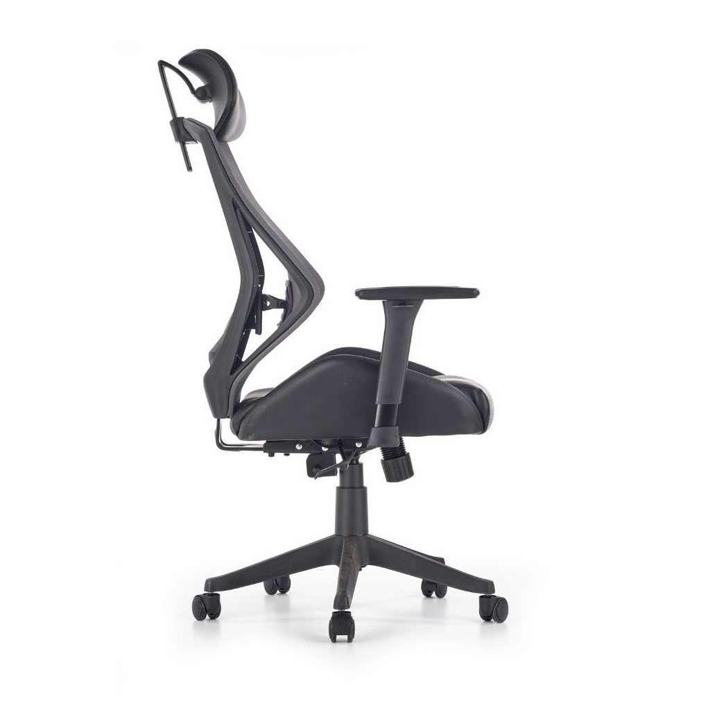 Sedák židle je čalouněn eko kůží v černé barvě. Ergonomicky tvarovaný opěrák zad a hlavová opěrka jsou potaženy prodyšnou síťovinou, která je velice příjemná při jakýchkoliv teplotách.