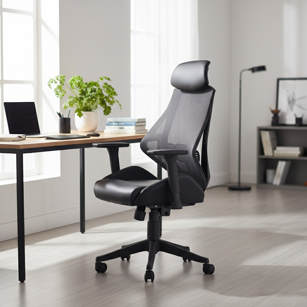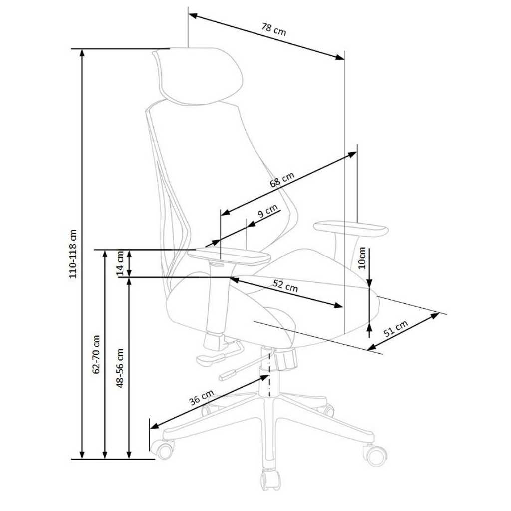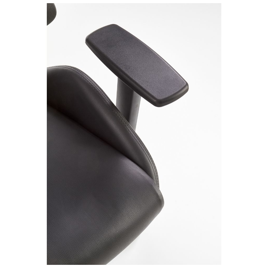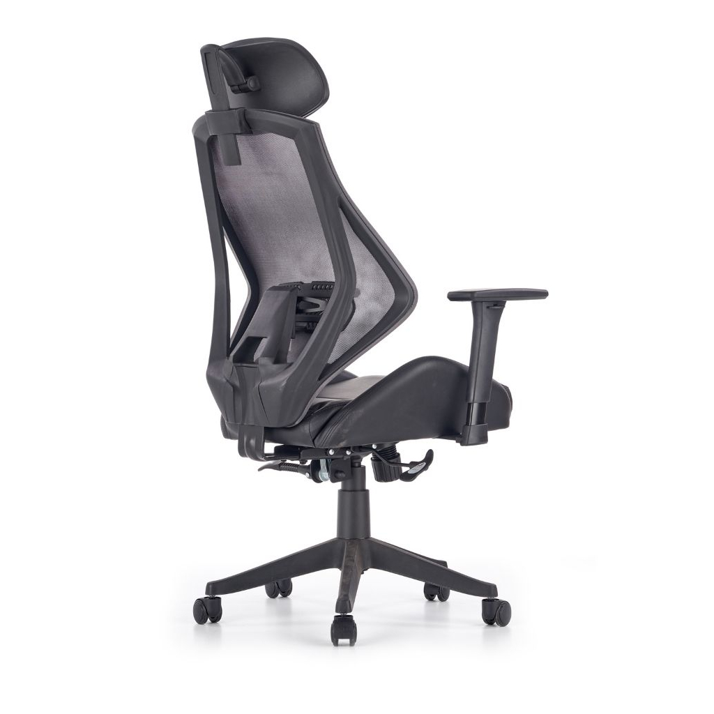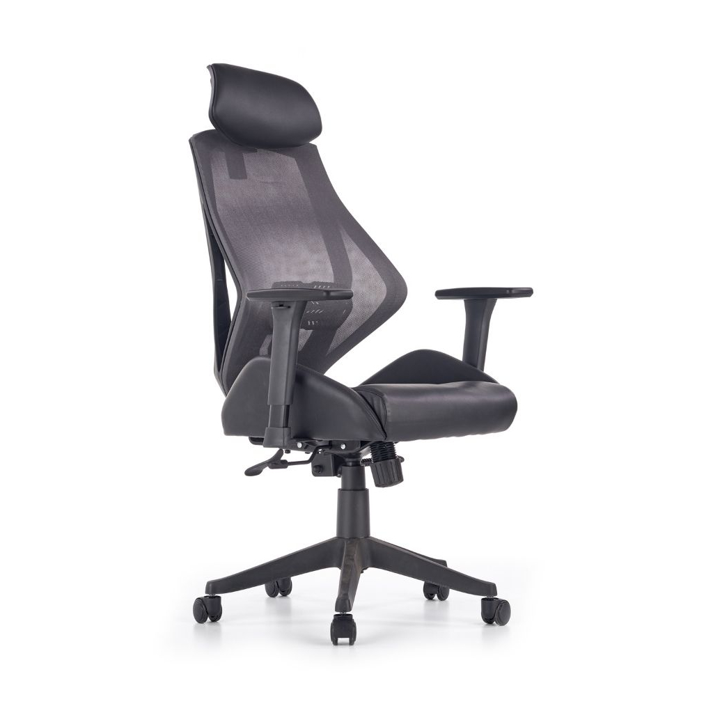 Sedák židle je čalouněn eko kůží v černé barvě. Ergonomicky tvarovaný opěrák zad a hlavová opěrka jsou potaženy prodyšnou síťovinou, která je velice příjemná při jakýchkoliv teplotách.
