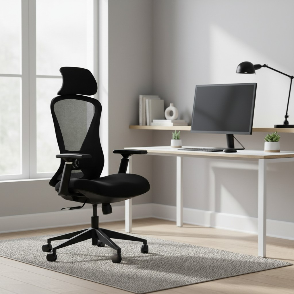 Sedák a opěrka hlavy otočné židle Renato mají potah z pevné černé membránové látky, u které nemusíte mít obavy z oděru. Zato zádový opěrák je potažený vzdušnou síťovinou.