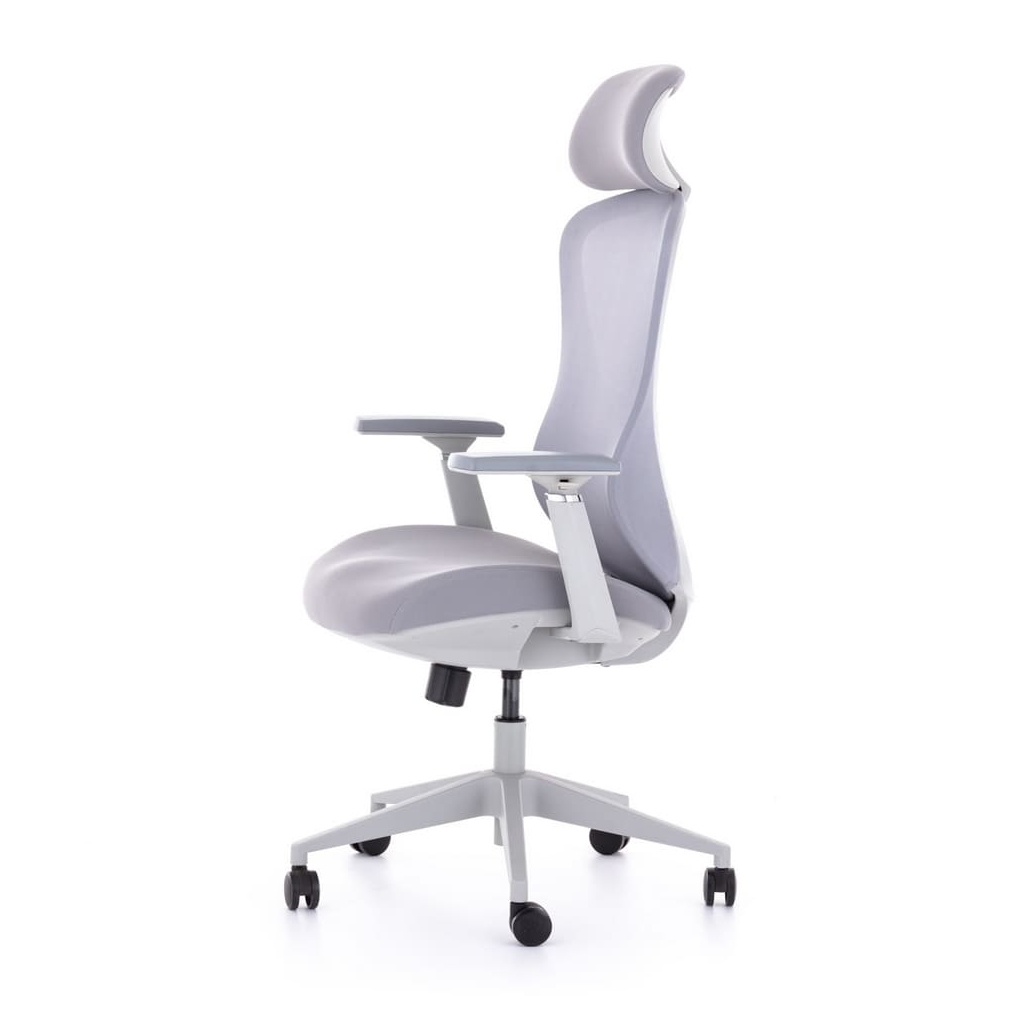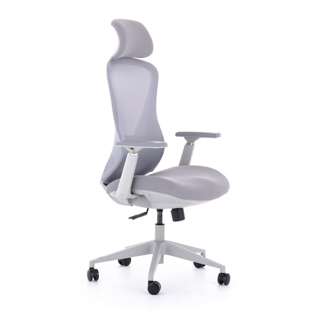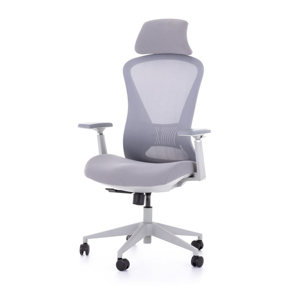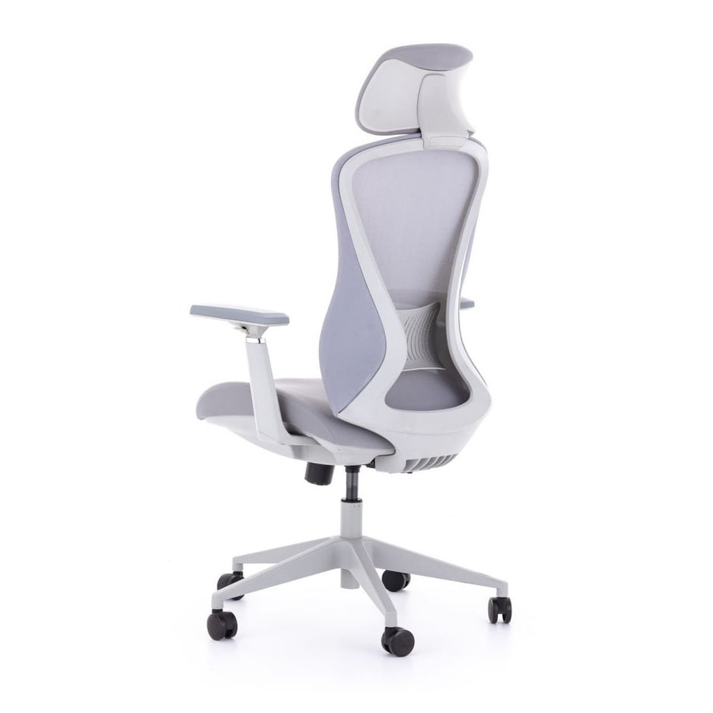 Sedák a opěrka hlavy otočné židle Renato II mají potah z pevné šedé membránové látky, u které nemusíte mít obavy z oděru. Zato zádový opěrák je potažený vzdušnou síťovinou.