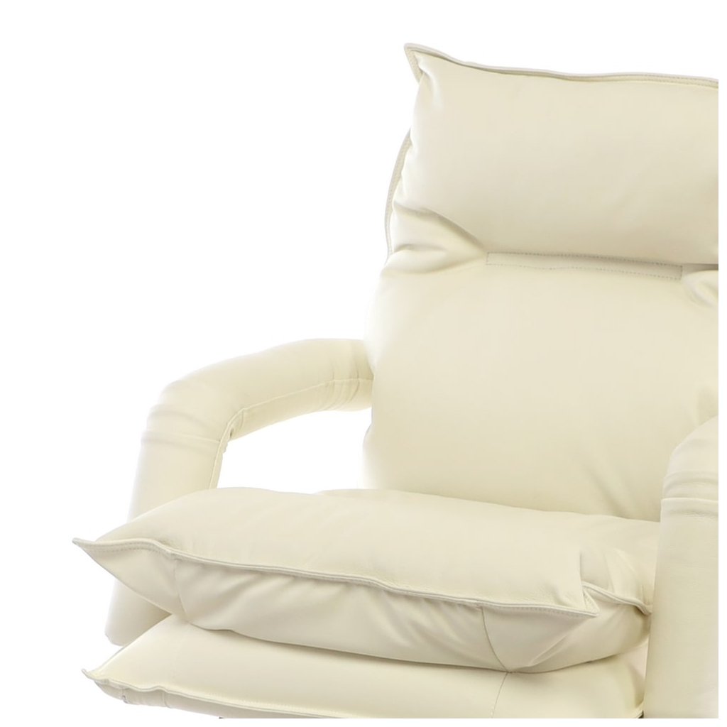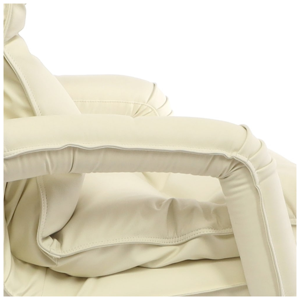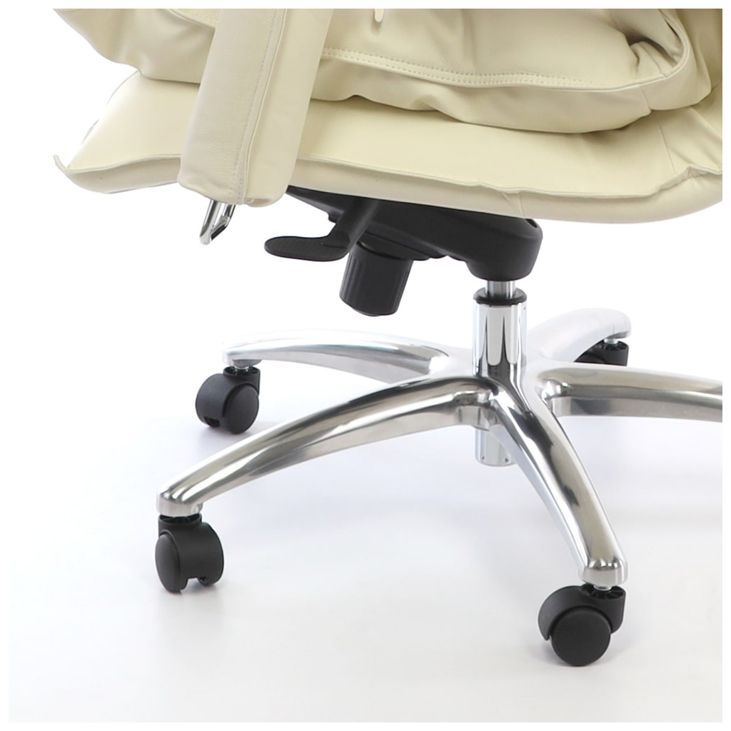 Dotyková část opěráku a sedáku křesla je čalouněna do pravé kůže v decentní béžové barvě. Područky jsou rovněž potažené tímto exkluzivním potahem.
