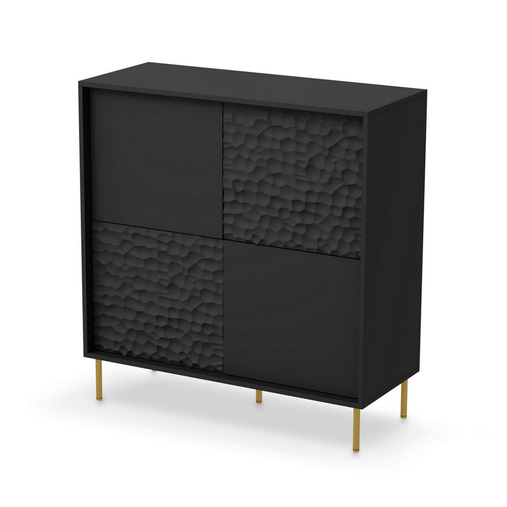Desky komody tvoří laminovaná dřevotříska a dřevovlákno (MDF) ve vkusné barvě. Nožky jsou pak z pozlaceného kovu.