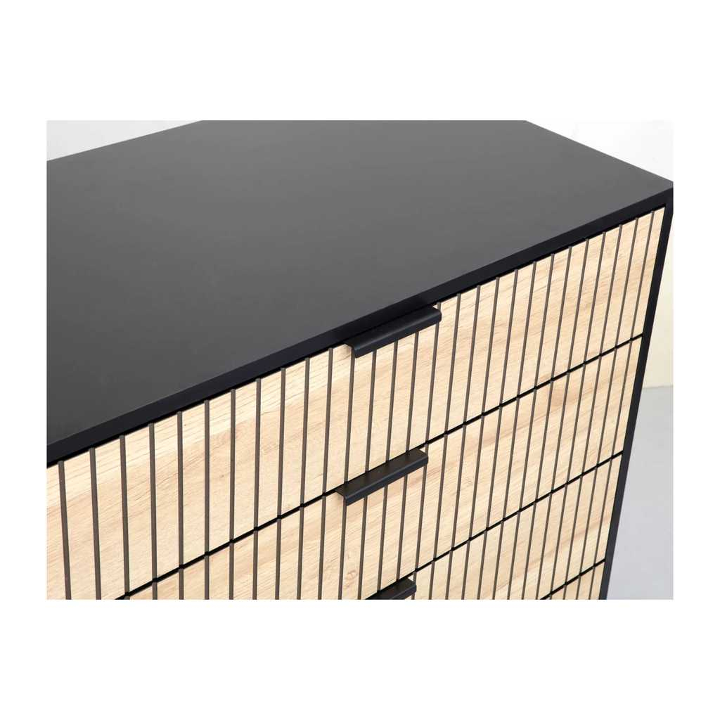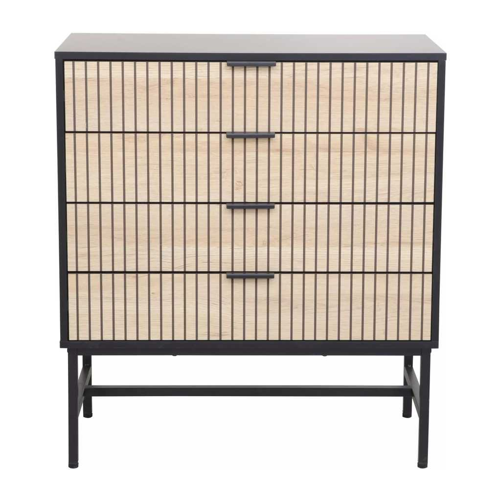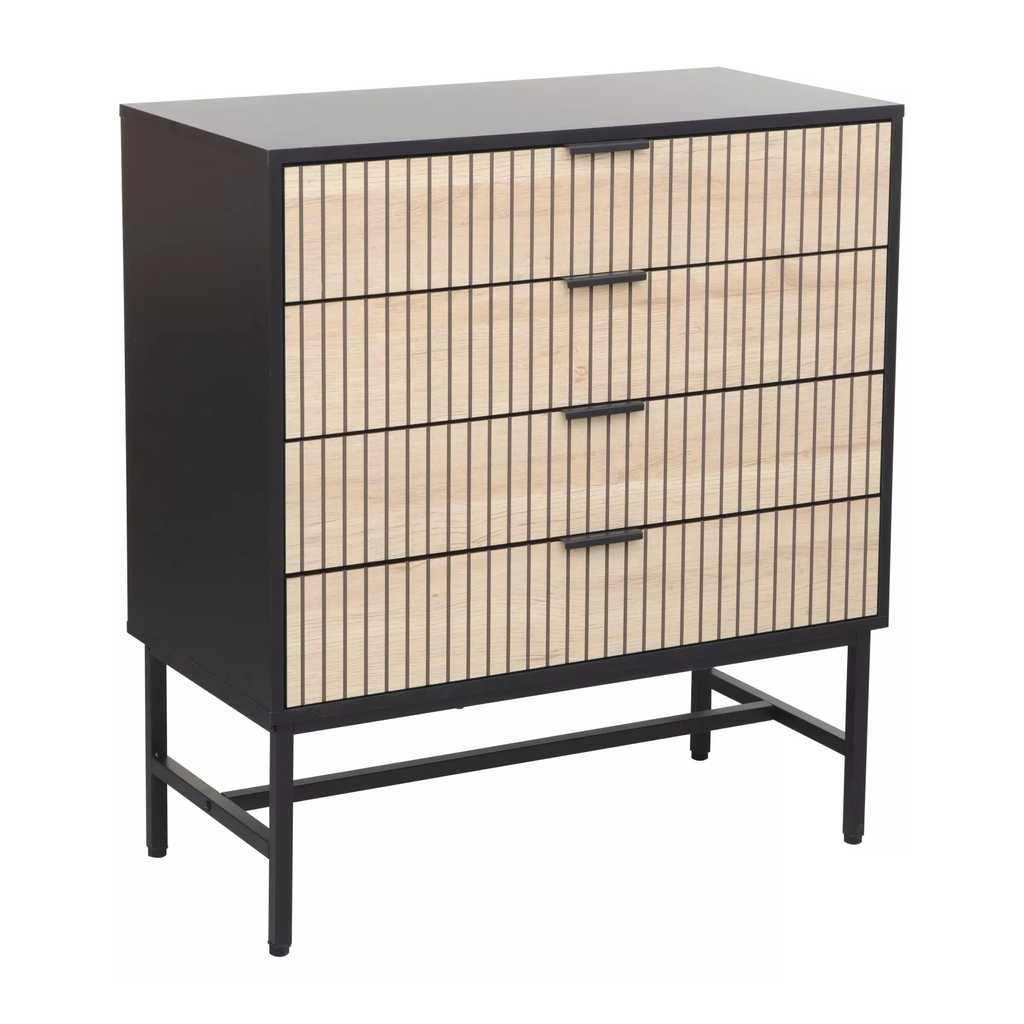 Komoda Cabredo II je praktický a stylový kus nábytku, který nabízí ideální kombinaci dřeva a kovu pro pevnost a odolnost. Je navržena tak, aby poskytovala dostatek úložného prostoru ve čtyřech prostorných zásuvkách. Její rozměry jsou ideální pro menší i středně velké místnosti, což zaručuje snadné umístění bez zbytečného zabírání prostoru.