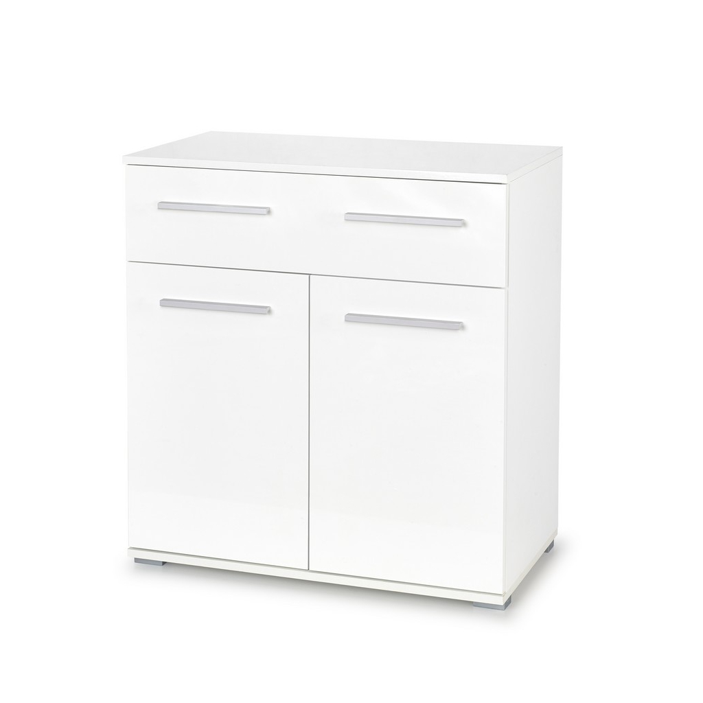 Korpus komody je vyrobený z laminovaných MDF desek ve vysokém lesku. Konstrukce obsahuje 1 široký šuplík a 1 policovou skříň se dvěma dvířky opatřenými kovovými úchytkami.