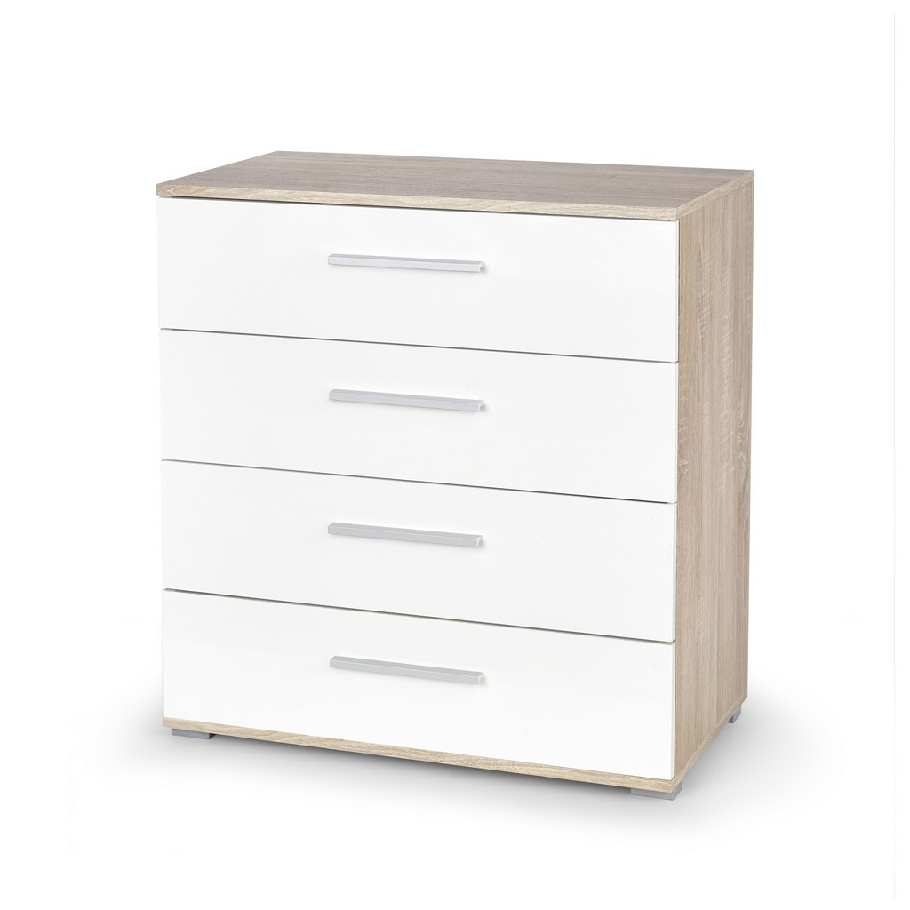 Korpus komody je vyrobený z laminovaných MDF desek ve vysokém lesku. Konstrukce obsahuje 4 šuplíky opatřené kovovými úchytkami.
