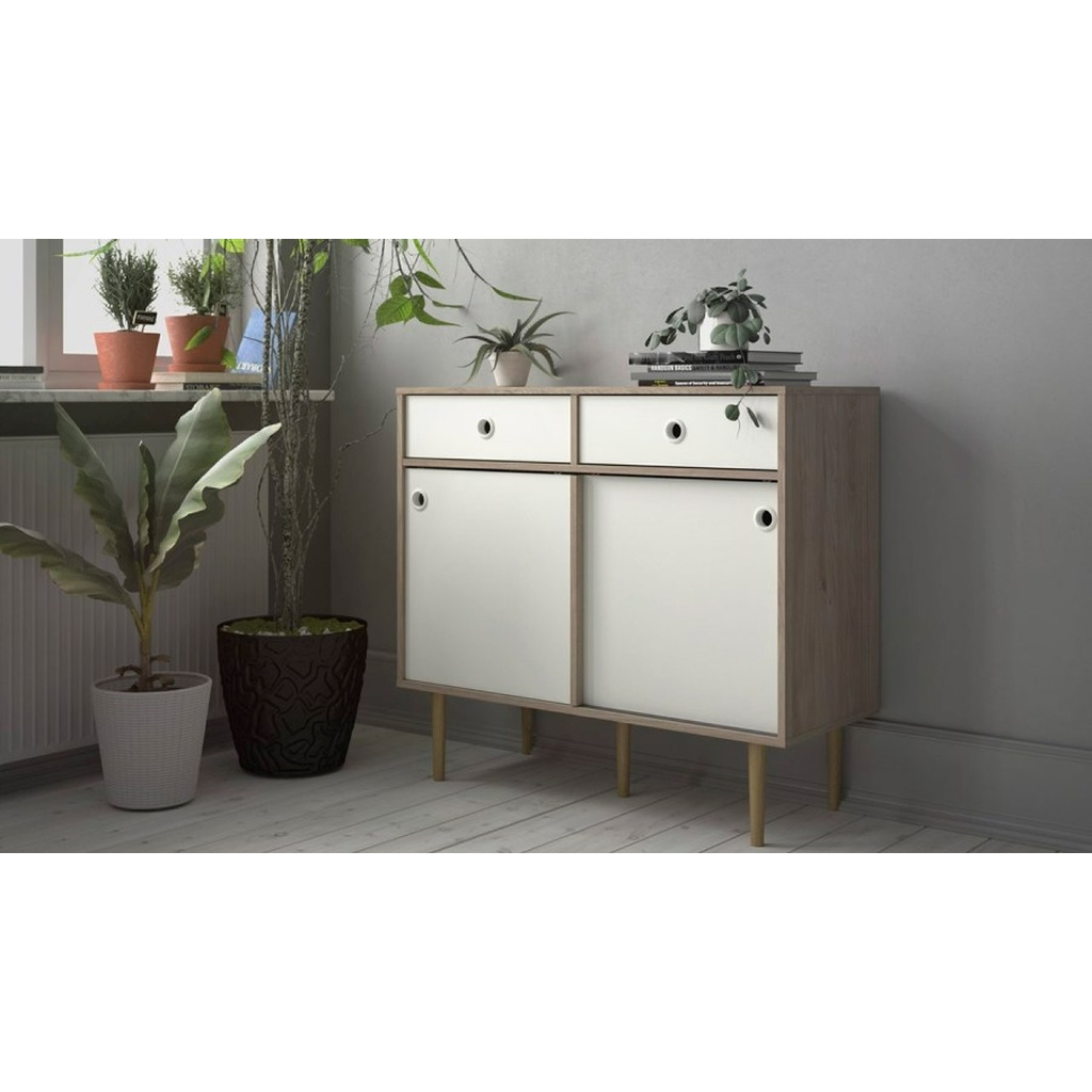 Díky posuvným dvířkům a prostoru za nimi snadno organizujete své věci a přitom ušetříte místo. Vysoké nožky nejen opticky odlehčují komodu, ale také usnadňují úklid pod ní.