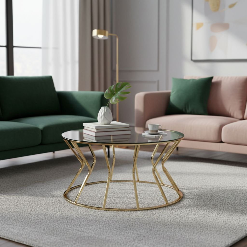 Zlatý konferenční stolek Afina bude ozdobou moderního interiéru, zkrášlí obývací pokoj, salónek, kavárnu nebo čekárnu.