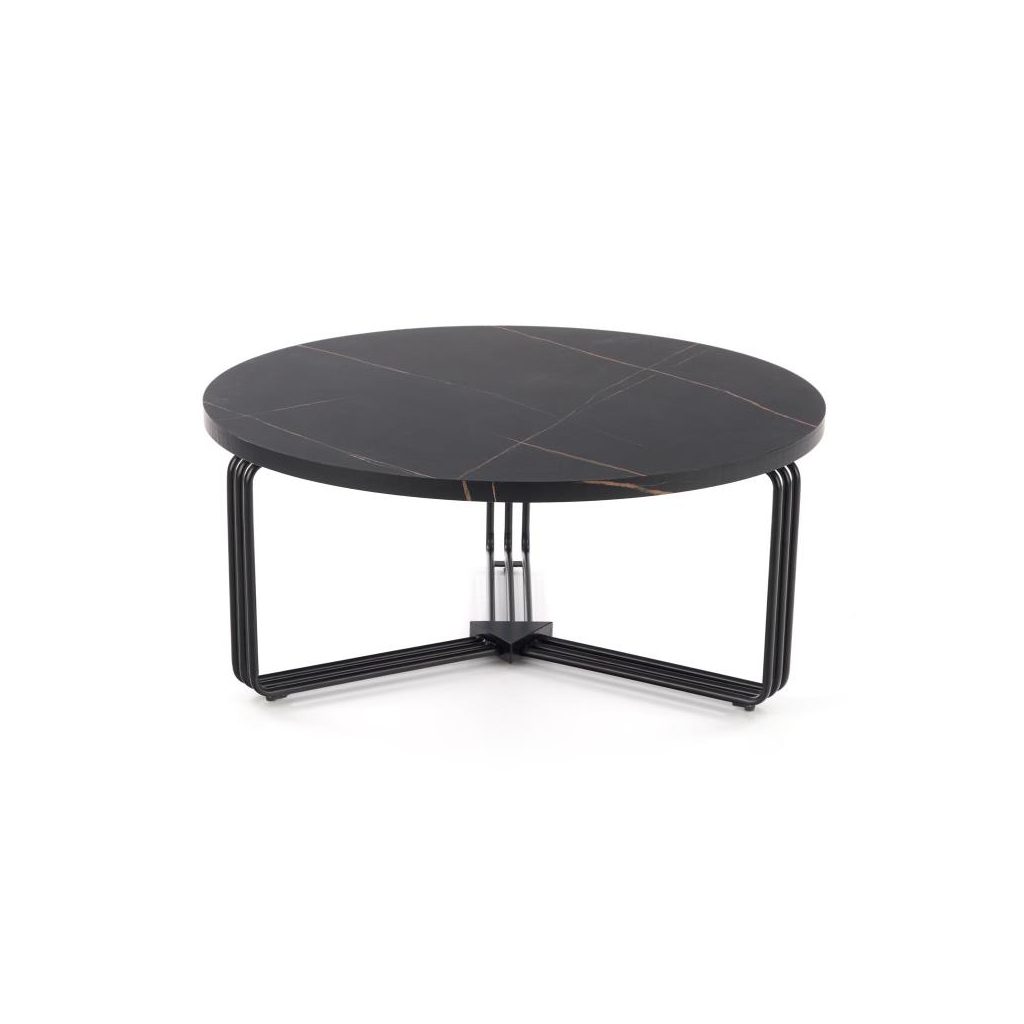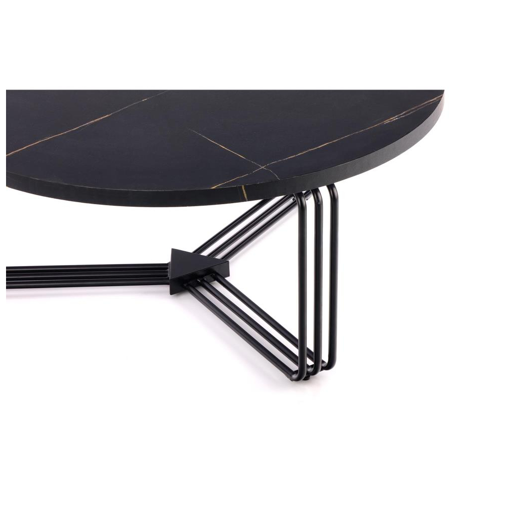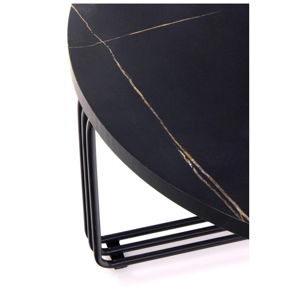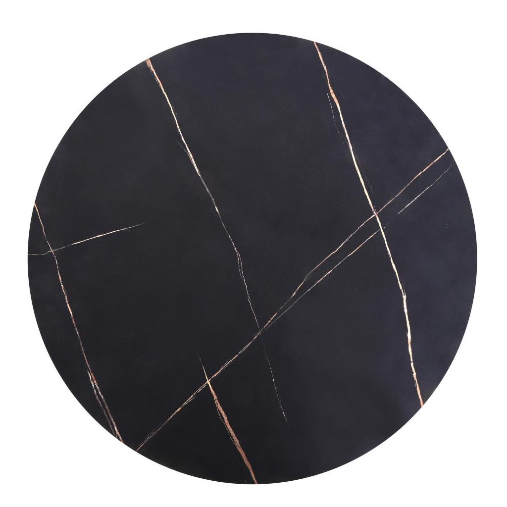 Deska stolu je vyrobená z dřevovláknitého materiálu a dýhy v imitaci mramoru. O stabilitu stolu se postará kovová podnož v atypickém provedení.