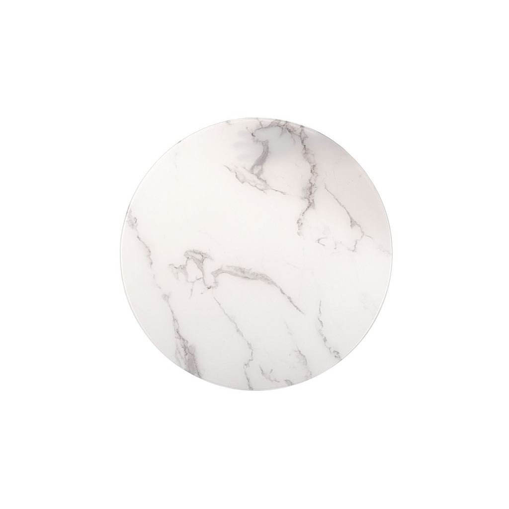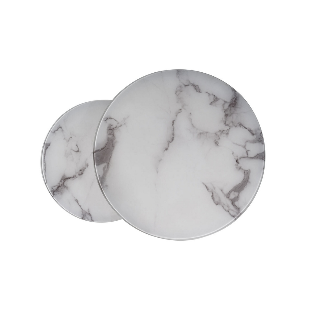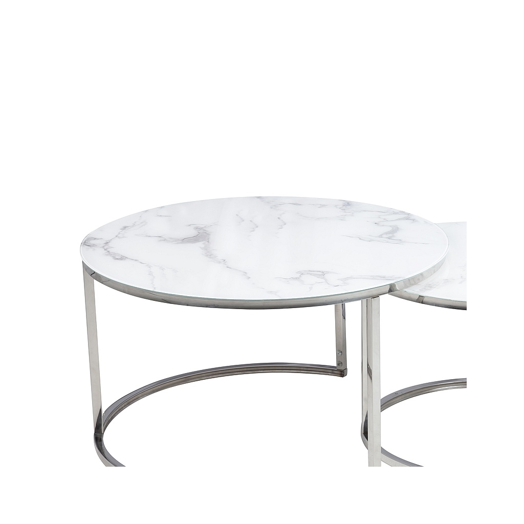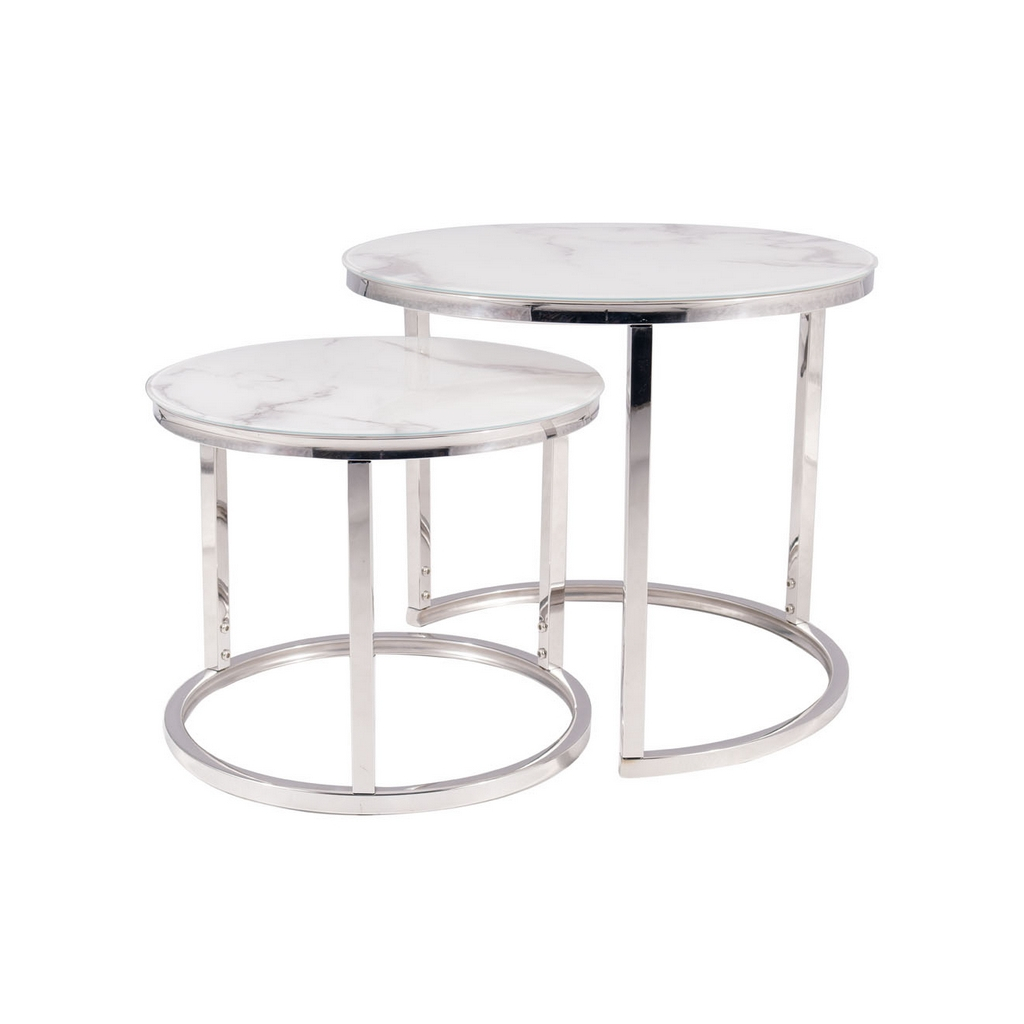 Desky stolu jsou vyrobené ze skla s efektem mramoru, podnož pak tvoří kov v chromované úpravě. Lesklé rámy s oblými základnami podporují celkový minimalistický vzhled.