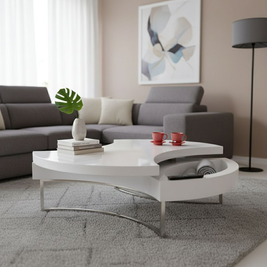 Designový konferenční stolek Aurea si vás získá svým netradičním vzhledem. Pod vrchní deskou stolu z lakovaného dřevovlákna se nachází úložné místo, které objevíte pomocí otočení desky. Tento prostor slouží k uložení drobností, kterými jsou například televizní ovladače. Pevná podnož z chromované oceli se postará o naprostou stabilitu stolu. Své uplatnění nalezne stolek Aurea především v moderních domácnostech a reprezentativních prostorech firem.