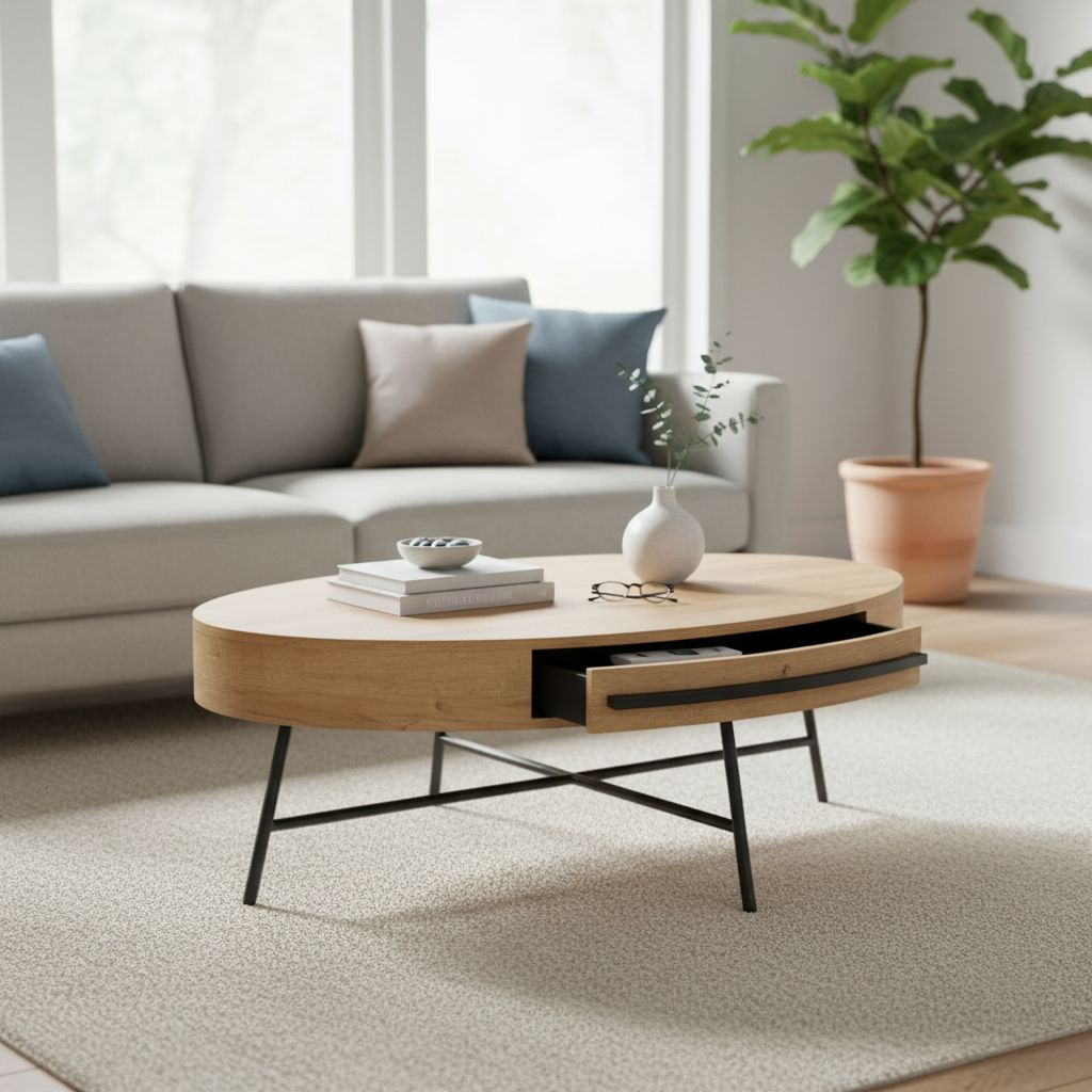 Konfereční stolek Carolina z dýhy v dekoru dubu zlatého nabízí nejen funkci odkládacího prostoru, ale také díky schovanému šuplíku i důmyslné úložiště.