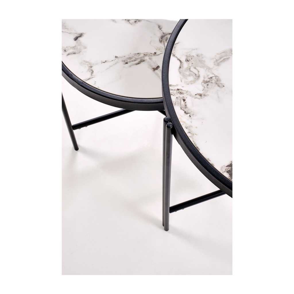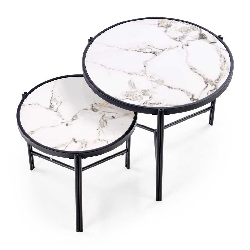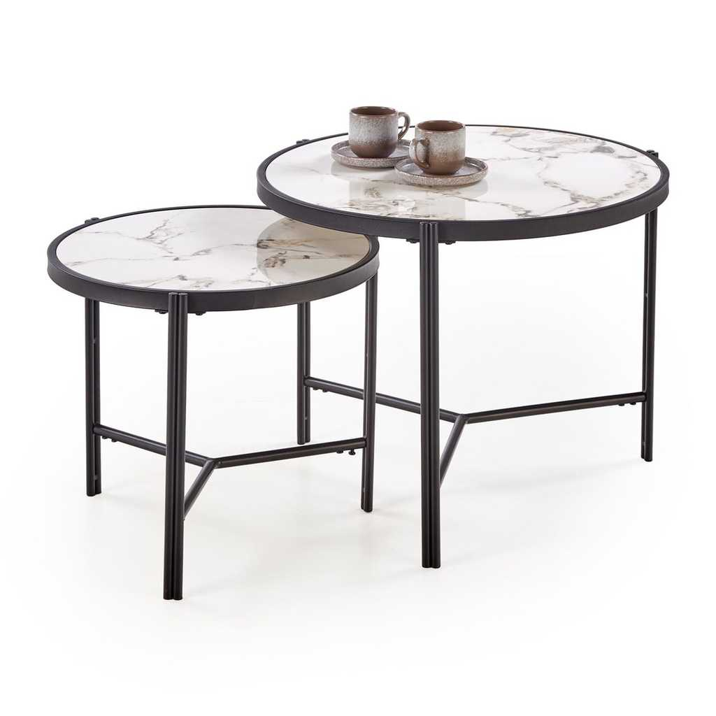 Oba stolky se pyšní kruhovou deskou z umělého kamene, kterou po obvodu chrání kovový lem. Ocelová je také podnož, která se s materiálem desky vkusně doplňuje.