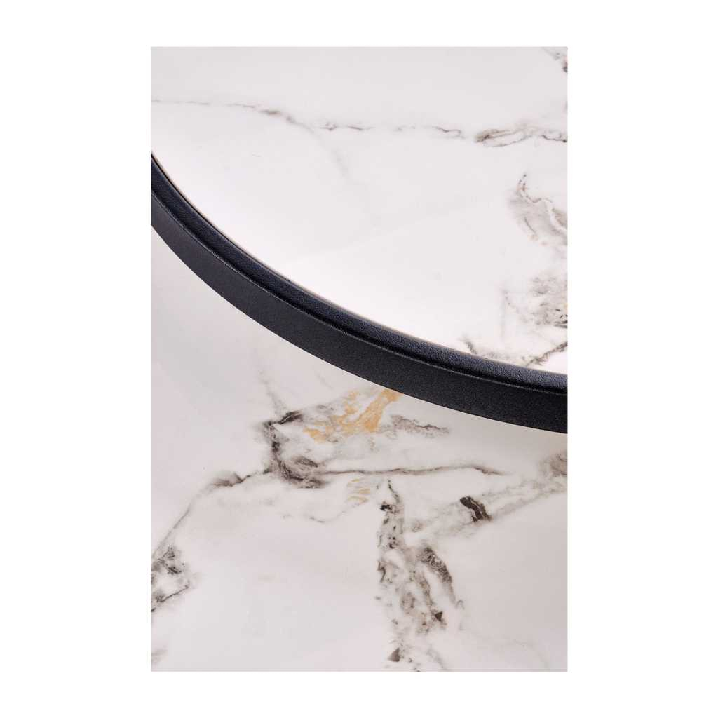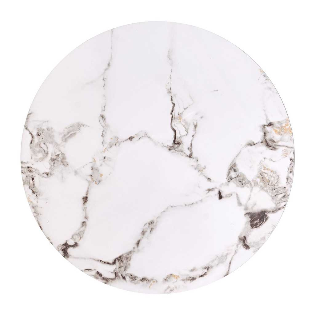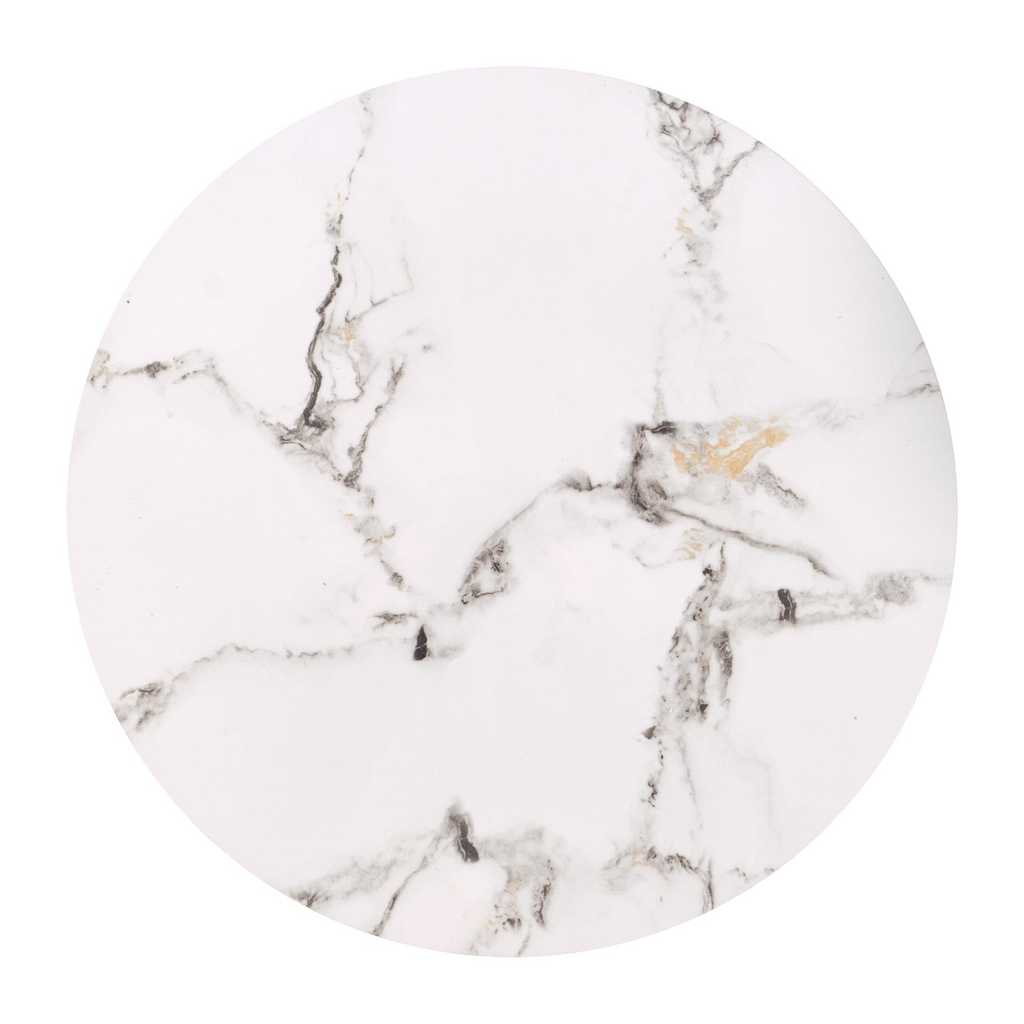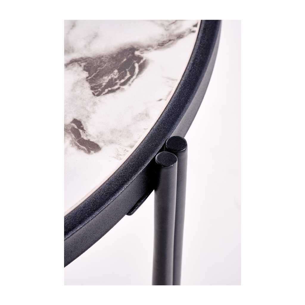 Oba stolky se pyšní kruhovou deskou z umělého kamene, kterou po obvodu chrání kovový lem. Ocelová je také podnož, která se s materiálem desky vkusně doplňuje.