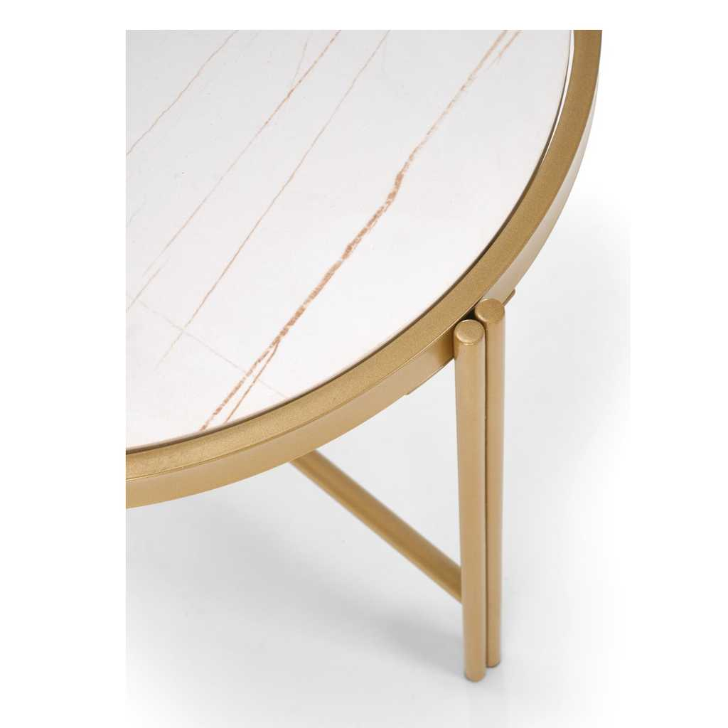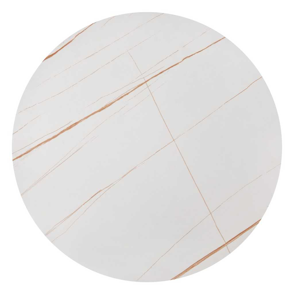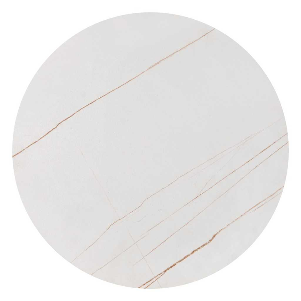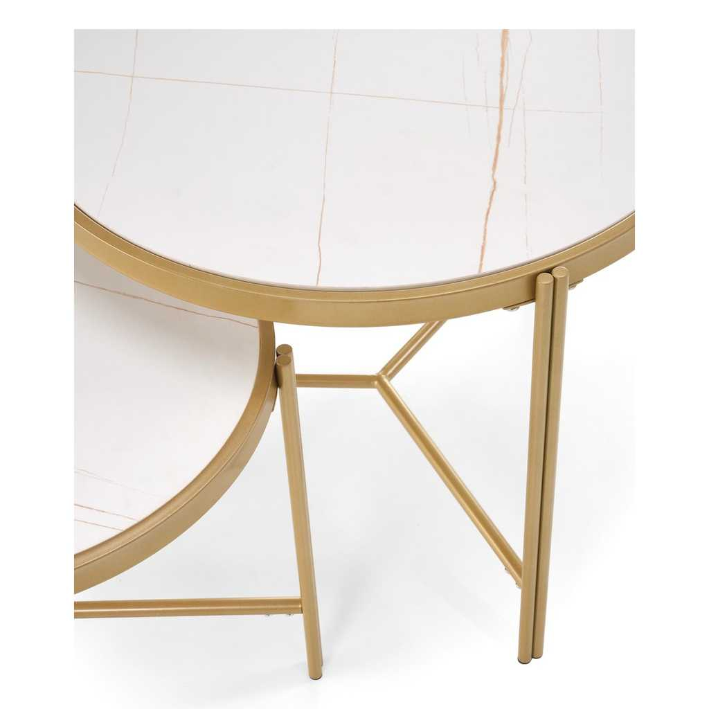 Oba stolky se pyšní kruhovou deskou z umělého kamene, kterou po obvodu chrání kovový lem. Ocelová je také podnož, která se s materiálem desky vkusně doplňuje.
