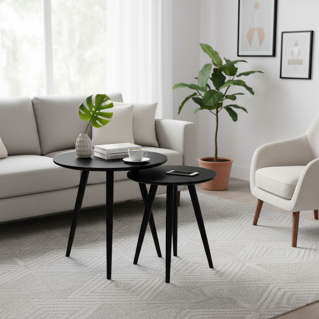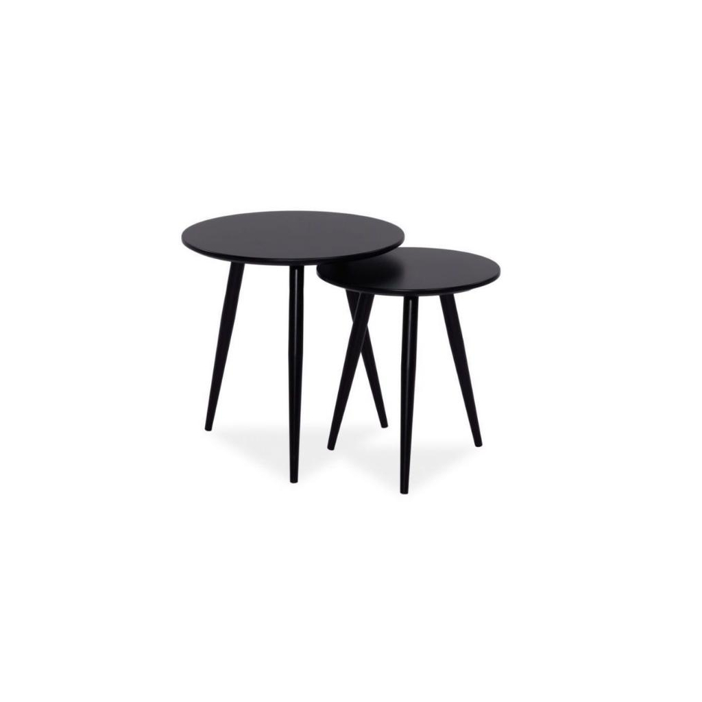 Set se skládá ze dvou konferenčních stolků lišících se pouze velikostí. Oba jsou kruhové, horní část mají vyrobenou z dřevovláknité desky a podnož z kovu.