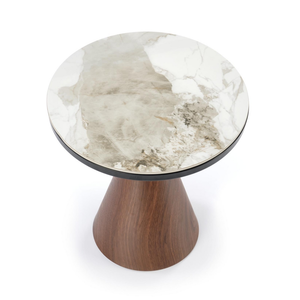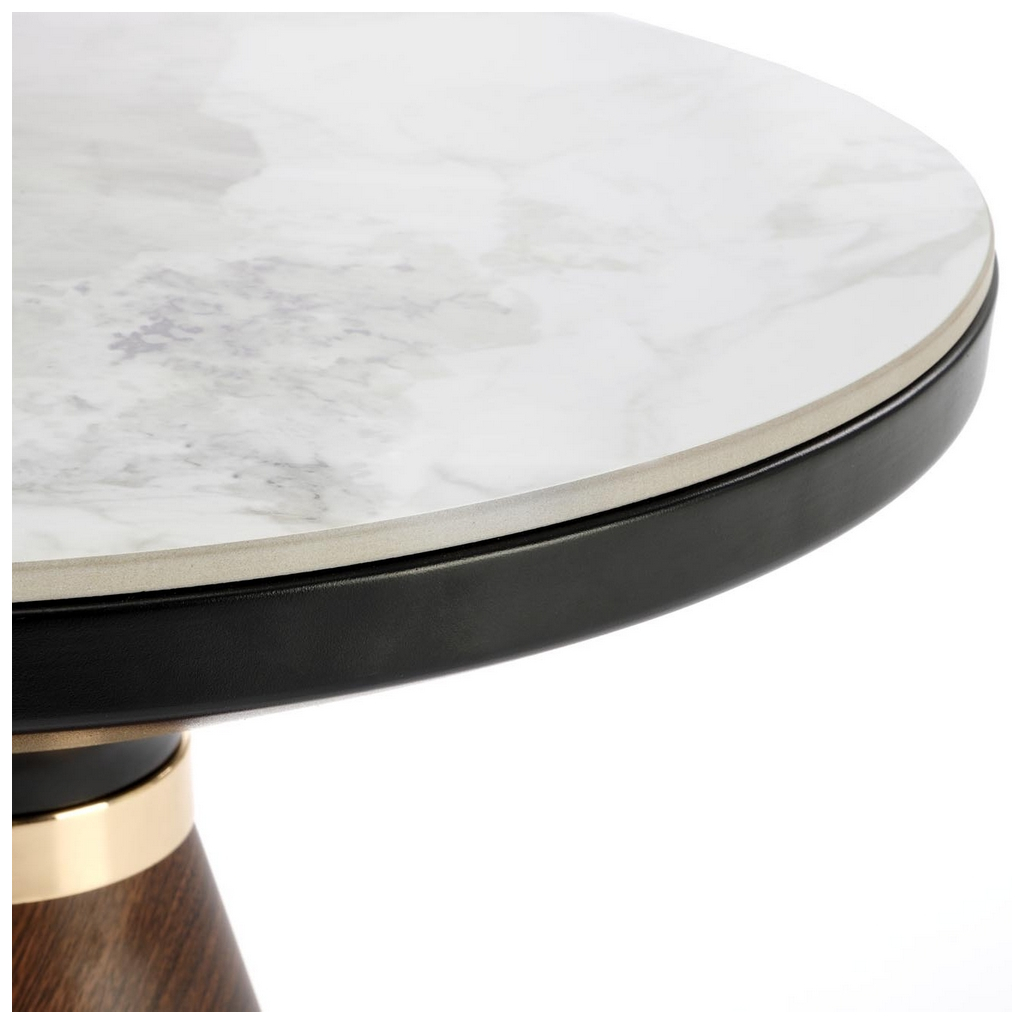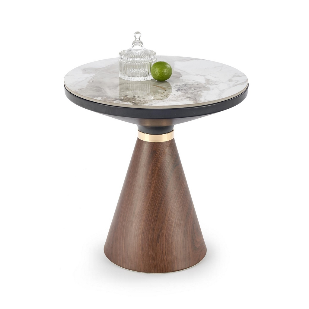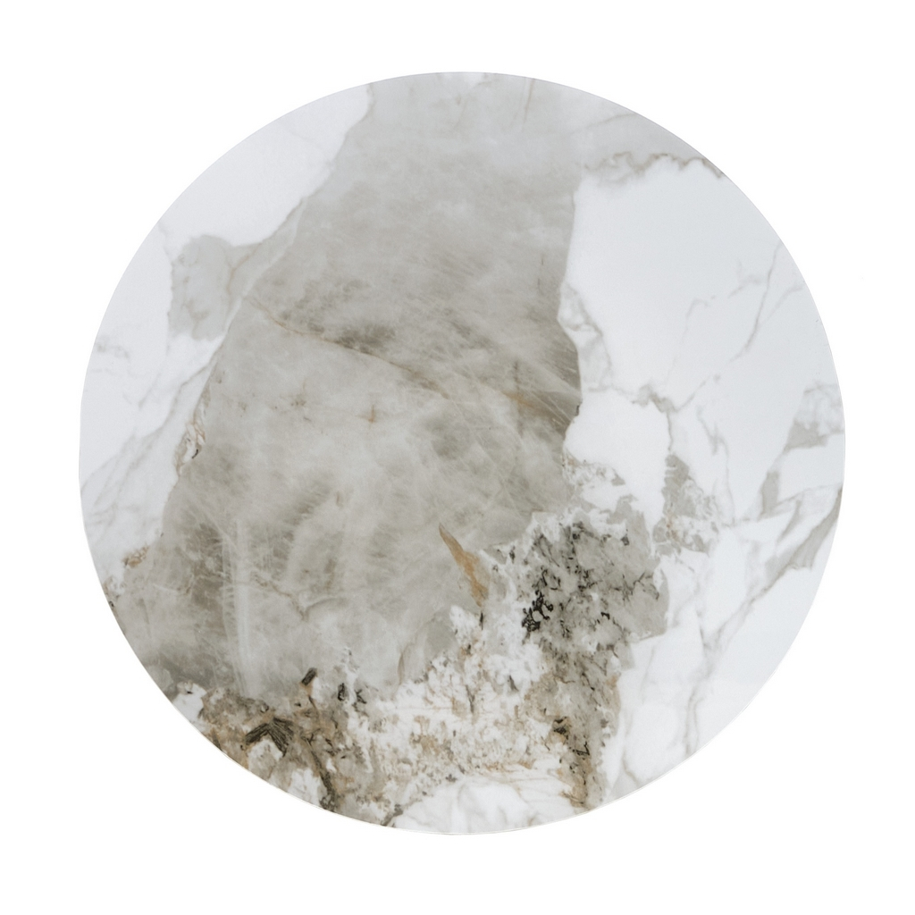 Kruhová deska s průměrem 50 cm je z keramiky a zdobí ji textura světlého mramoru. S tou kontrastuje černý kov, který se zužuje až ke zlatému prstenci v nejužší části nohy.