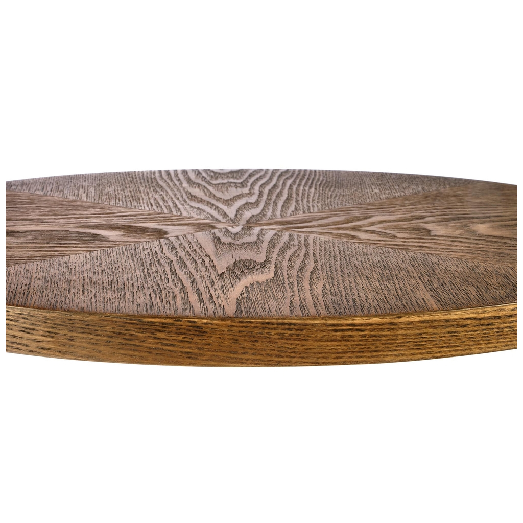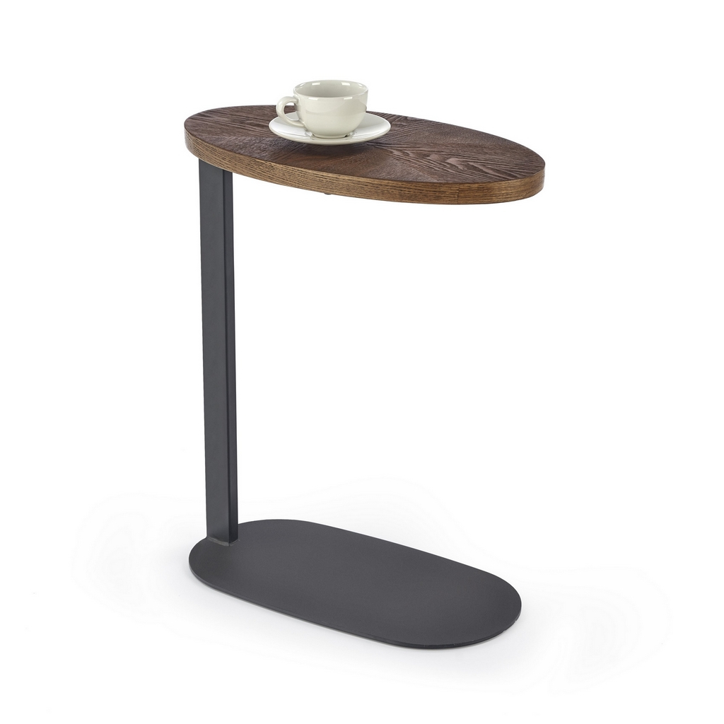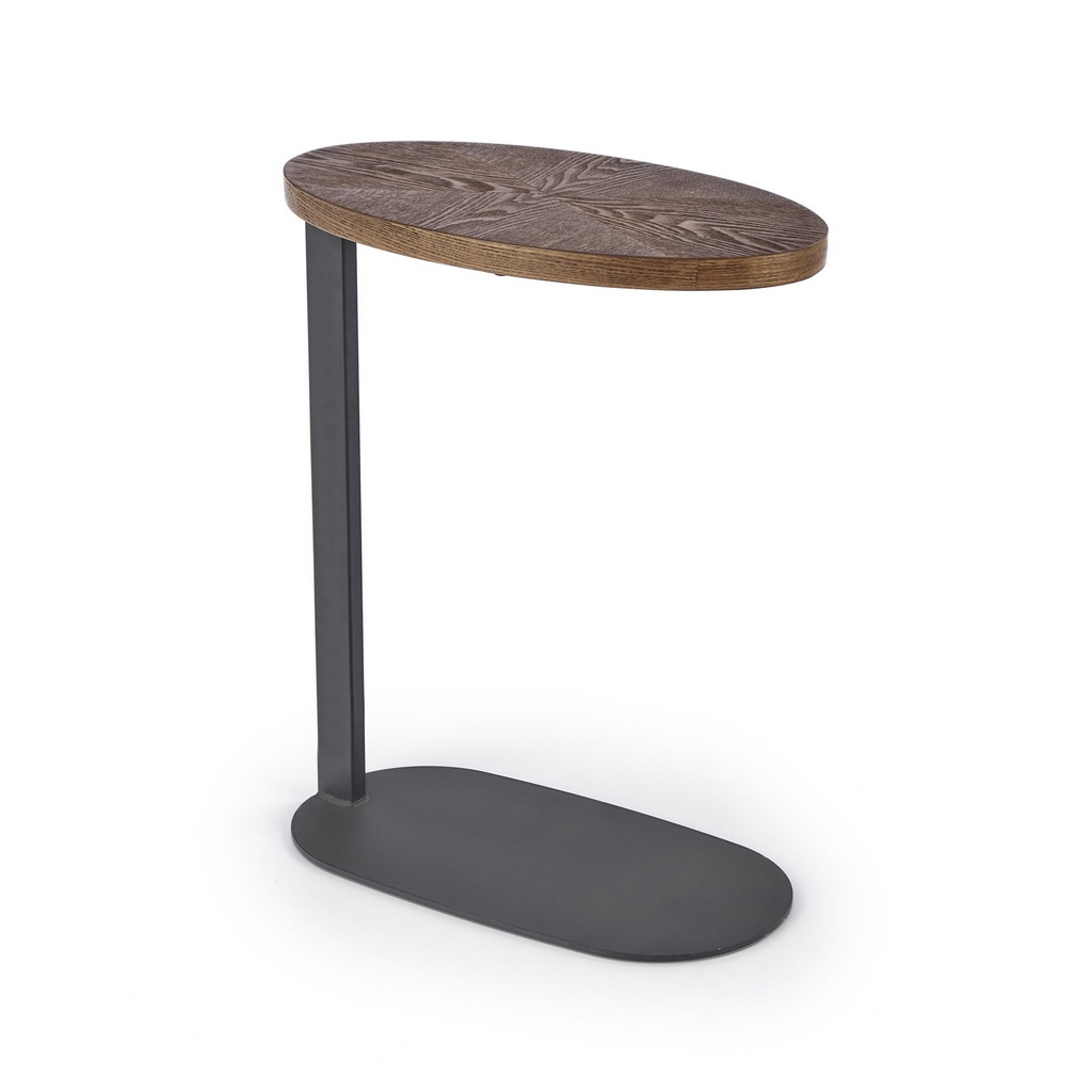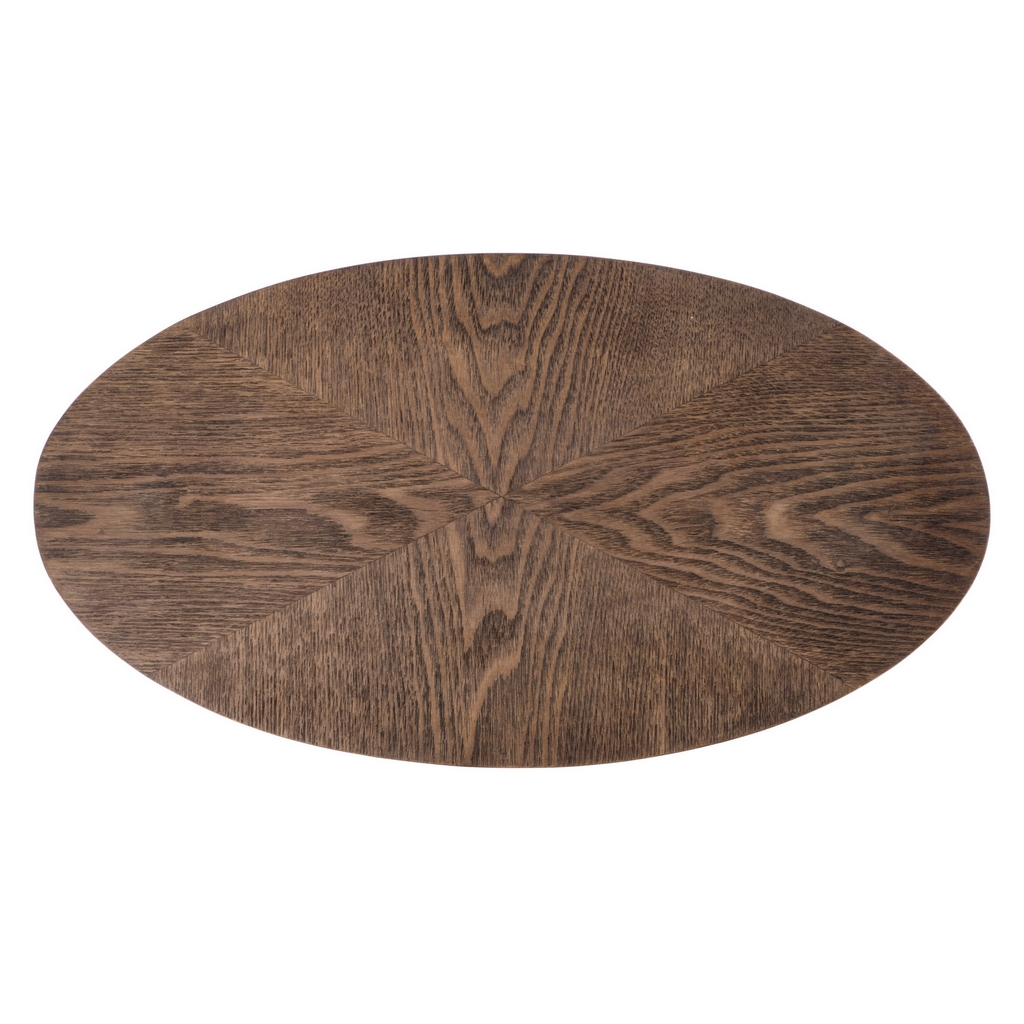 Oválná svrchní deska je z dýhovaného MDF (dřevovlákna) v dezénu ořechu. Struktura dýhy je ozvláštněná použitím více kusů, které na desce tvoří vzor ve tvaru X.