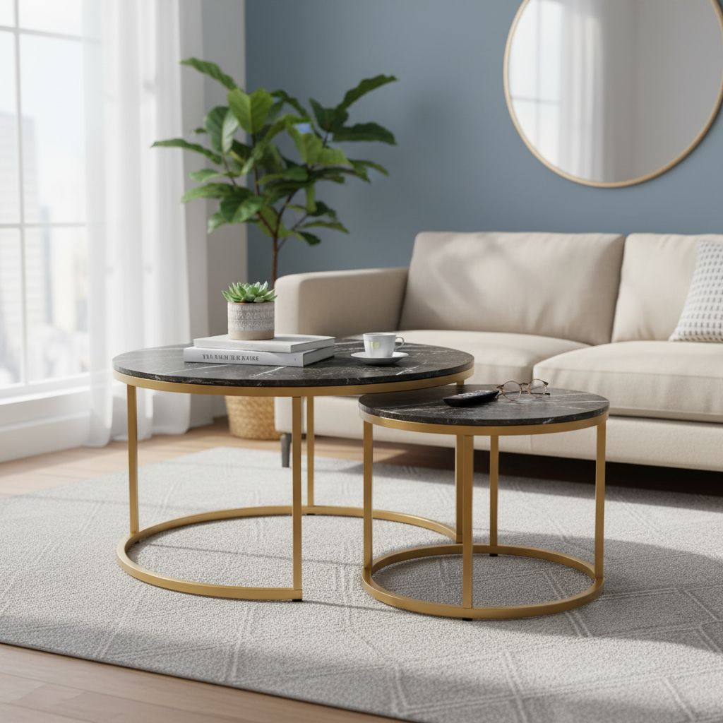 Oba stolky mají kruhovou desku z laminované dřevotřísky, kterou nese kovová podnož zlaté barvy. Ta se vkusně doplňuje s mramorovanou texturou desky.