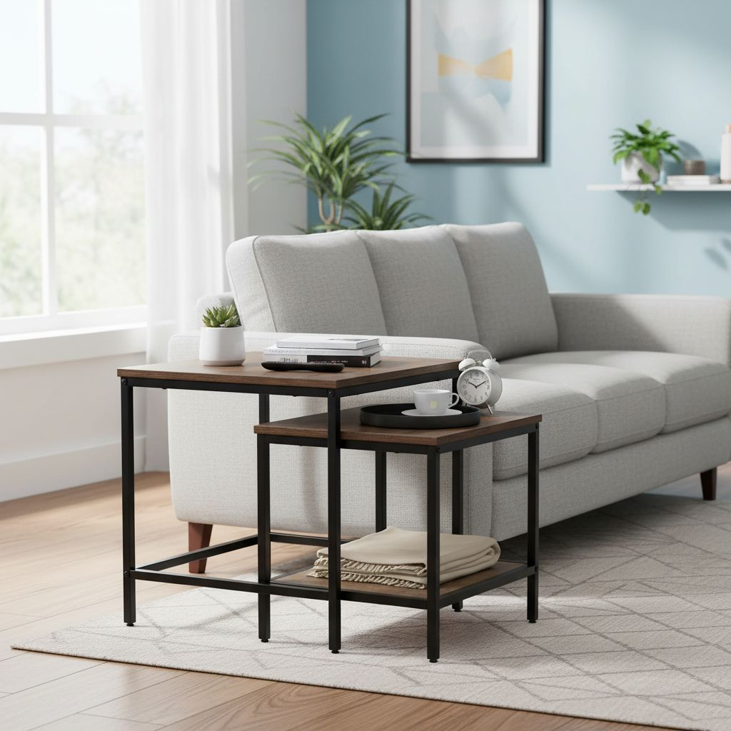 Oba stolky mají desku z laminované dřevotřísky v tmavě hnědém dezénu dřeva. Ten má úmyslně zašlý, takřka rustikální vzhled. Podnož je pak z černých kovových trubek.
