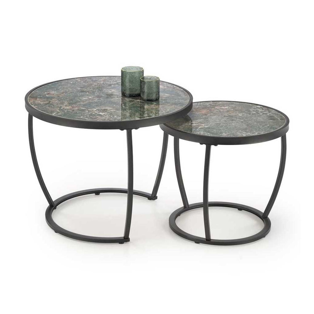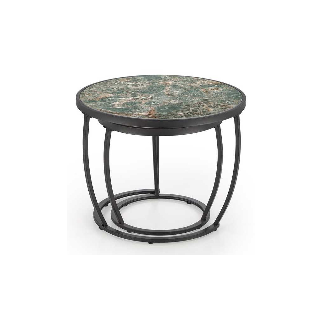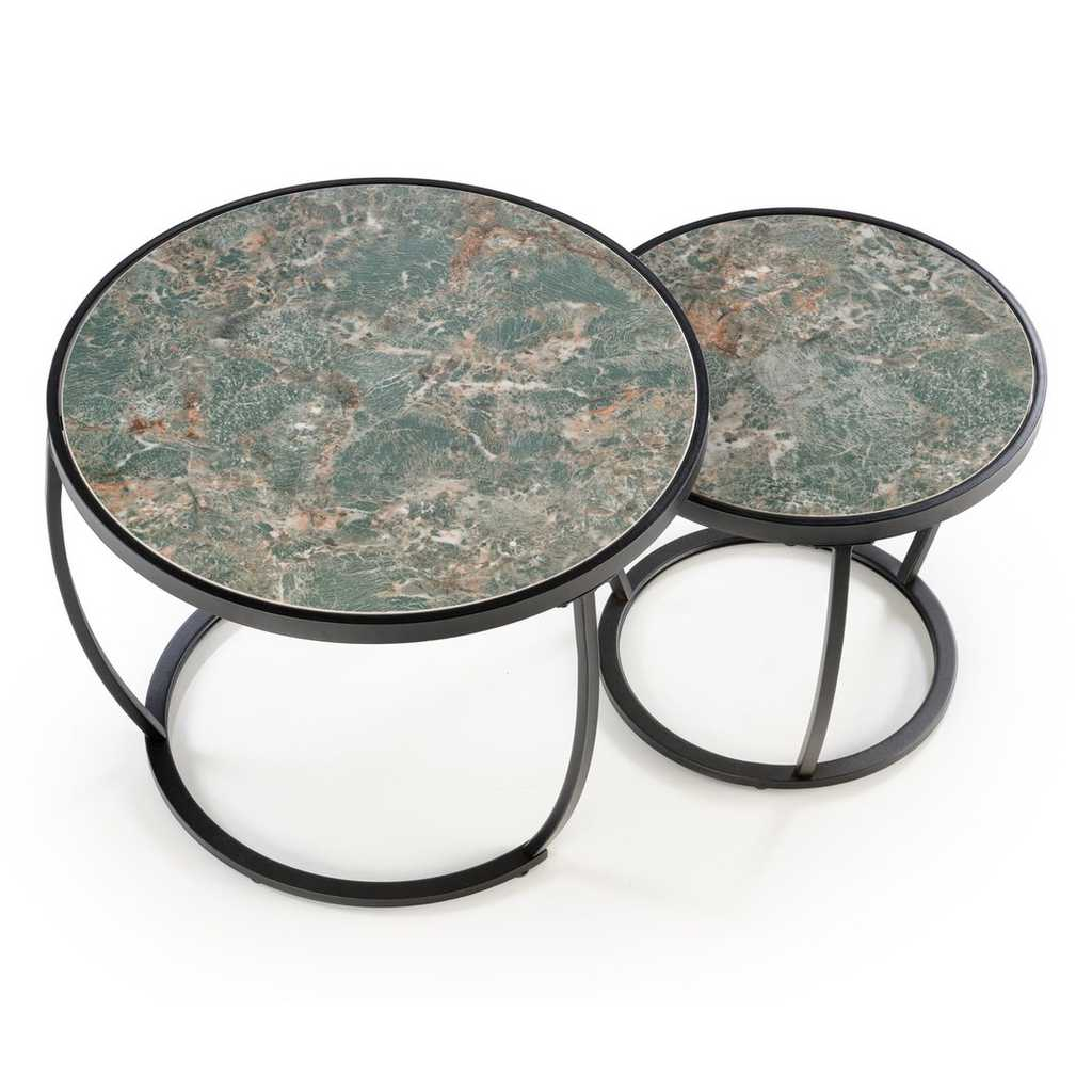 Oba stolky se pyšní kruhovou deskou z umělého kamene, kterou po obvodu chrání kovový lem. Ocelová je také podnož, která se s materiálem desky vkusně doplňuje.