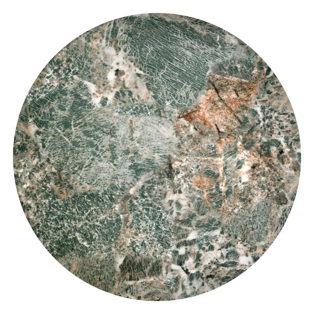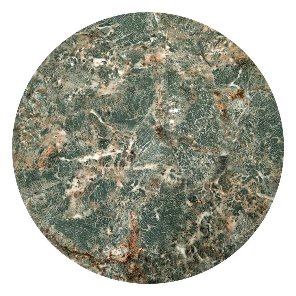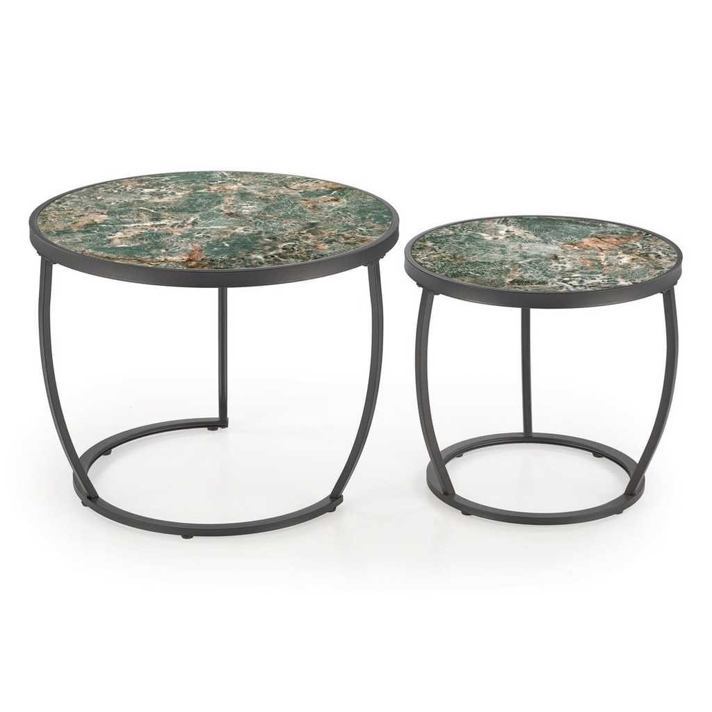 Oba stolky se pyšní kruhovou deskou z umělého kamene, kterou po obvodu chrání kovový lem. Ocelová je také podnož, která se s materiálem desky vkusně doplňuje.