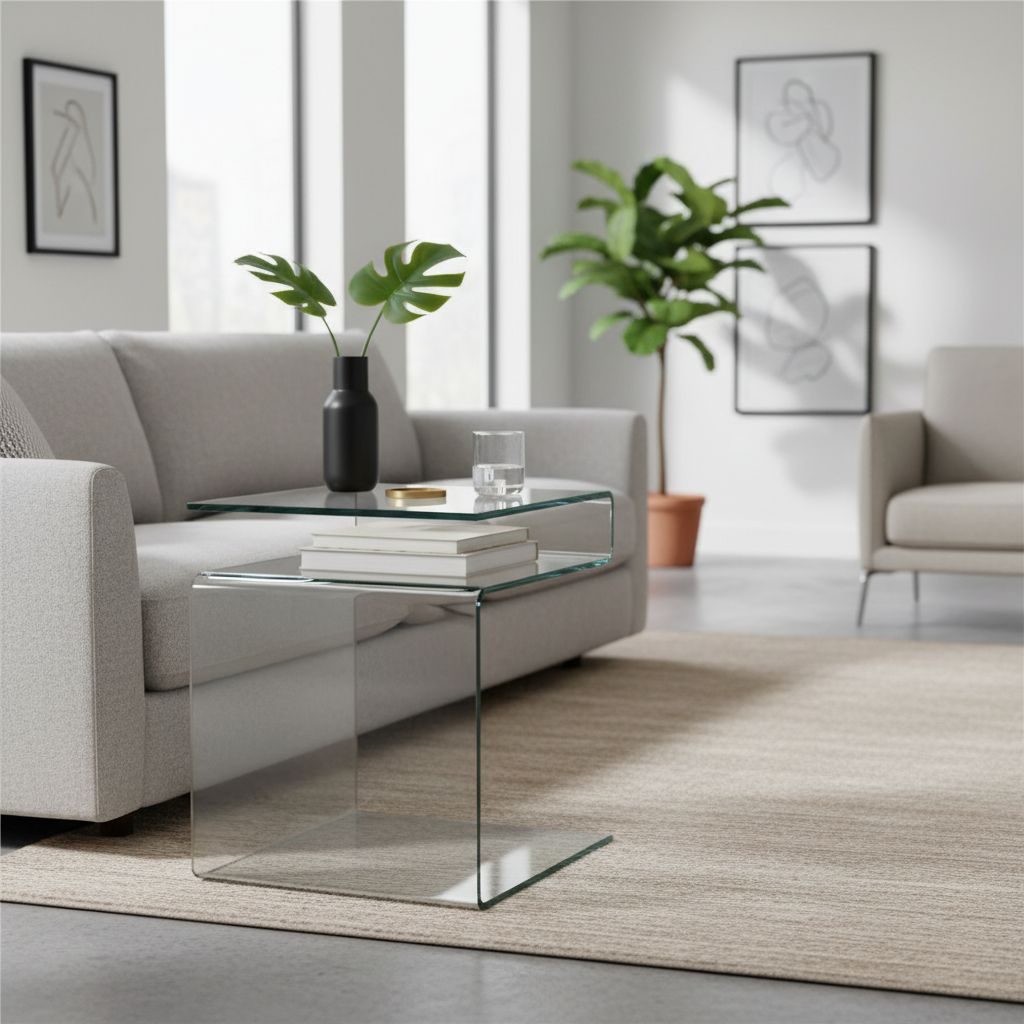 Stolek zahnutý do neobvyklého tvaru tvoří pod horní deskou odkládací poličku. Konferenční stolek Epi je celý vyrobený z tvrzeného skla. Snadno se proto udržuje a hodí se do každé místnosti.