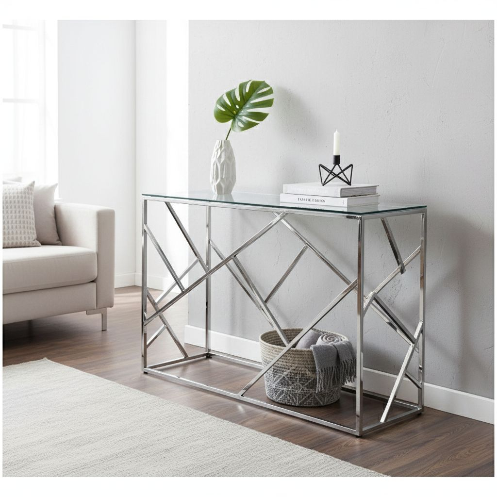 Horní deska z tvrzeného skla zaručuje snadnou údržbu a pevnost stolku. Lesklá kovová podnož společně s bočními příčkami tvoří zdobný prvek.