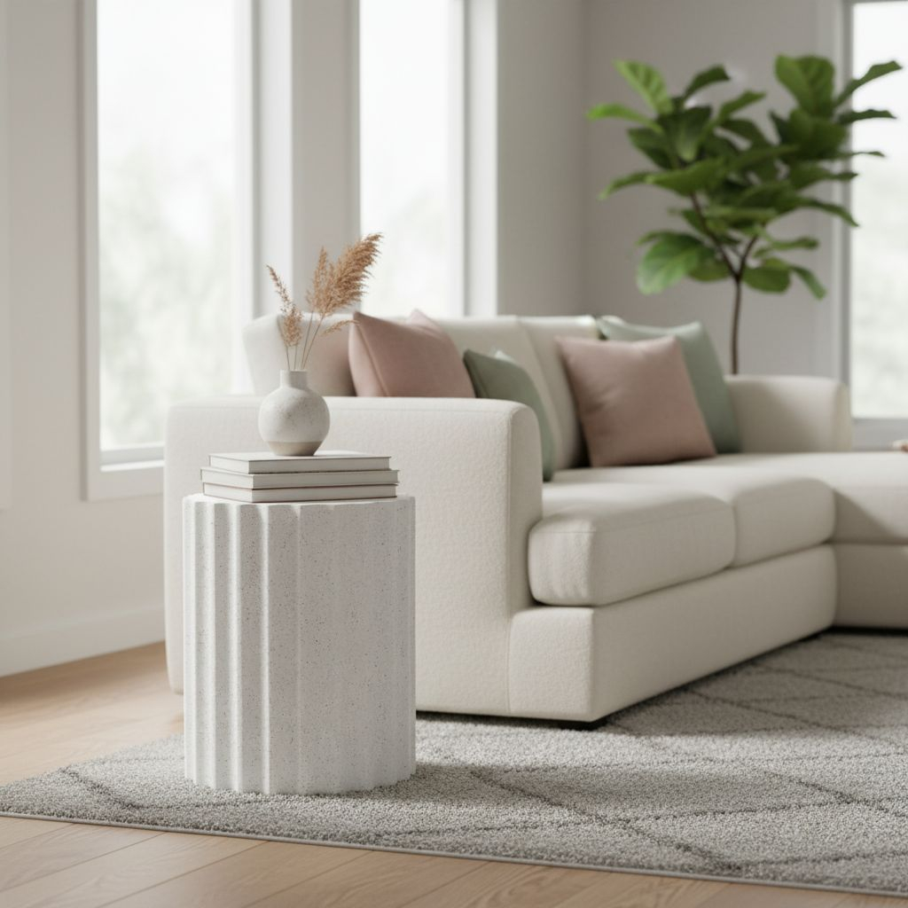Celý stolek je z jediného kusu kompozitu na bázi oxidu hořečnatého. To jednak znamená, že vás nečeká žádná montáž, jednak to stolku dává unikátní texturu – bílou barvu zdobí tmavší tečky. Po celém svém obvodu je stolek rýhovaný, což dále podtrhuje jeho nevšední vzhled.