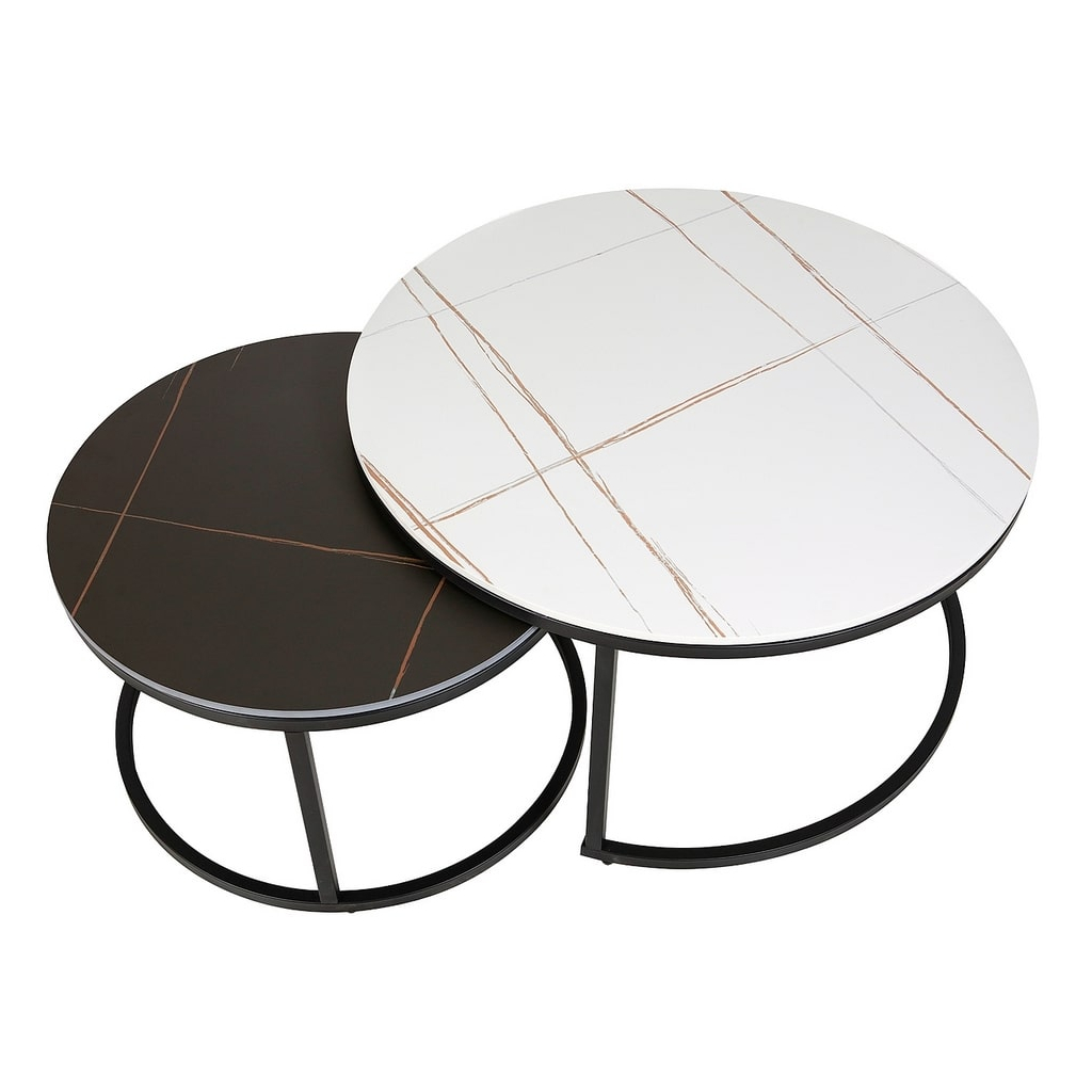 Oba stolky mají kruhovou desku z keramiky, kterou nese černá kovová podnož. U této varianty má větší stolek bílou desku a menší stolek černou.