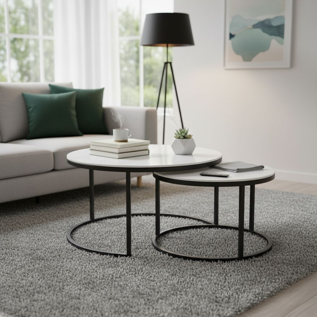 Oba stolky mají kruhovou desku z keramiky, kterou nese černá kovová podnož. U této varianty mají oba stolky bílou mramorovanou desku.