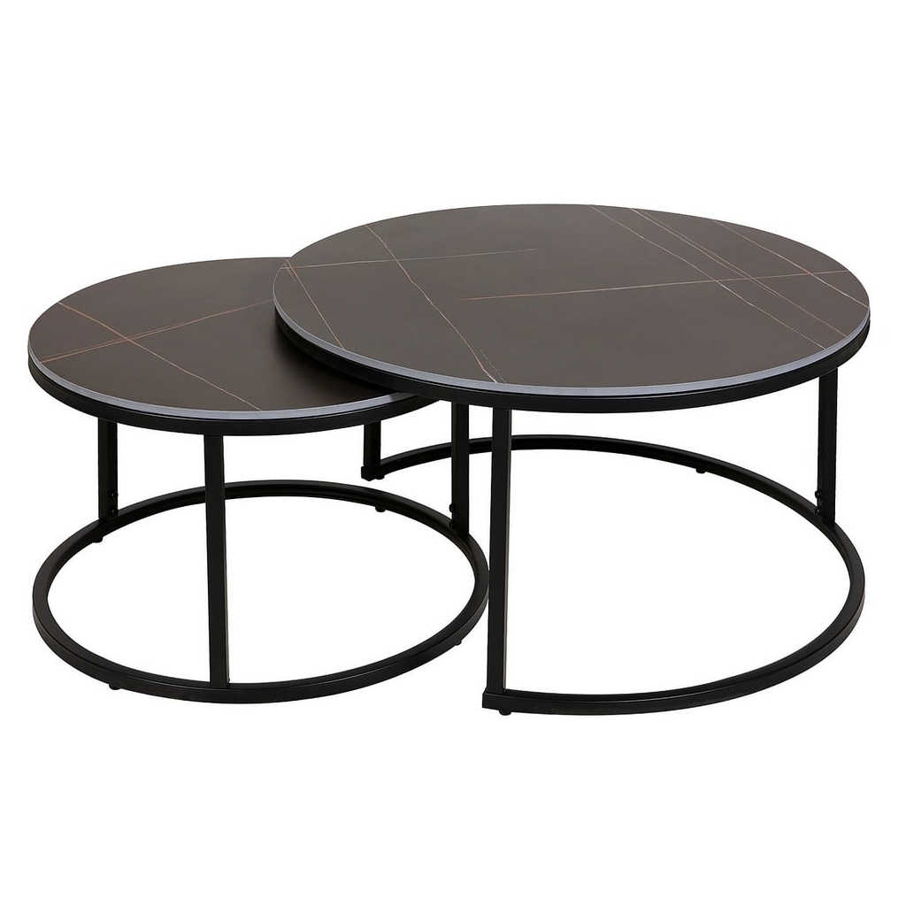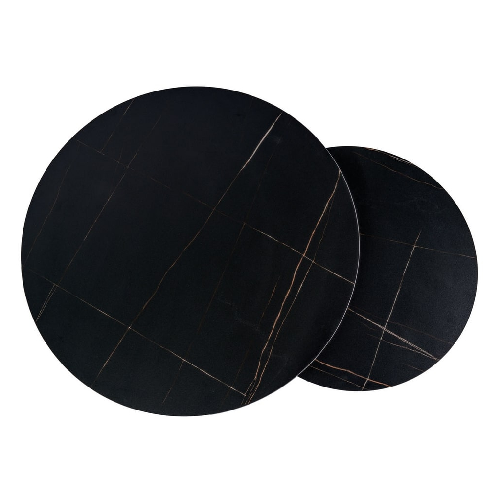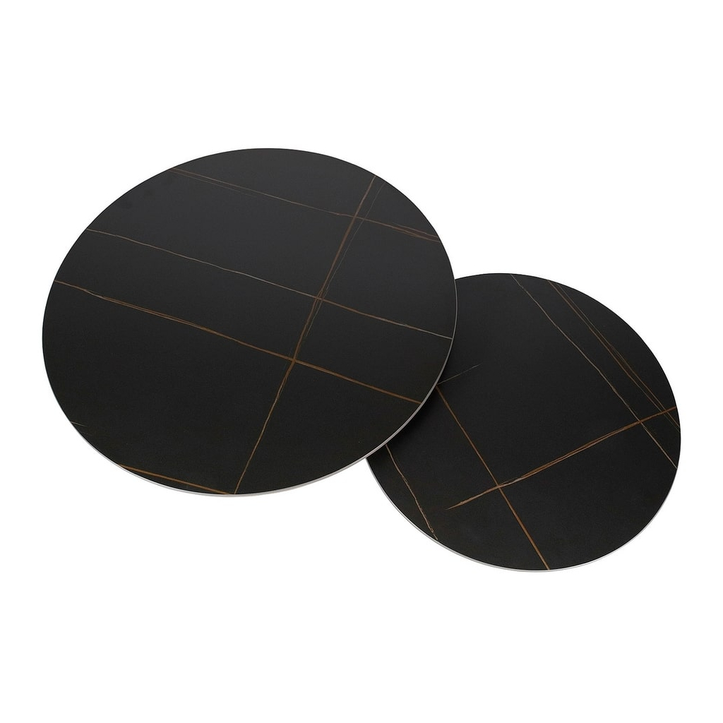 Oba stolky mají kruhovou desku z keramiky, kterou nese černá kovová podnož. U této varianty mají oba stolky černou žíhanou desku.