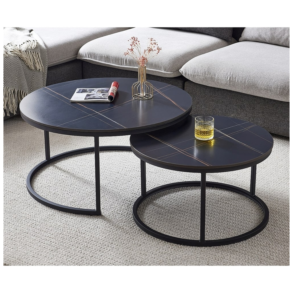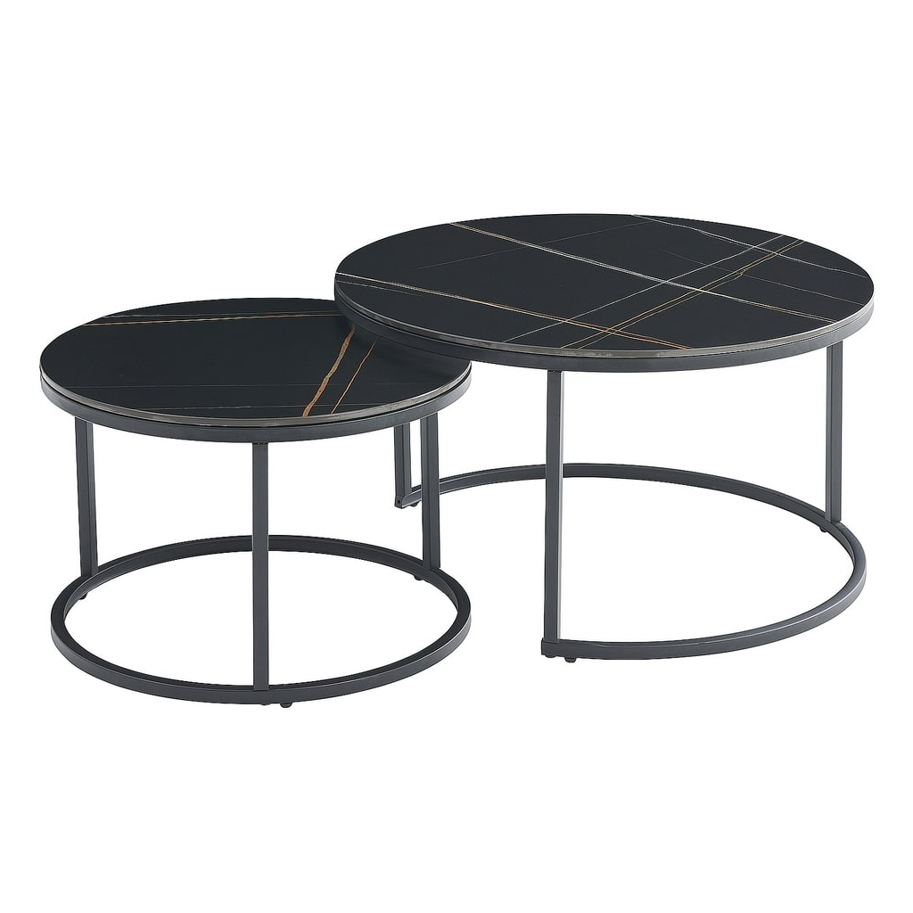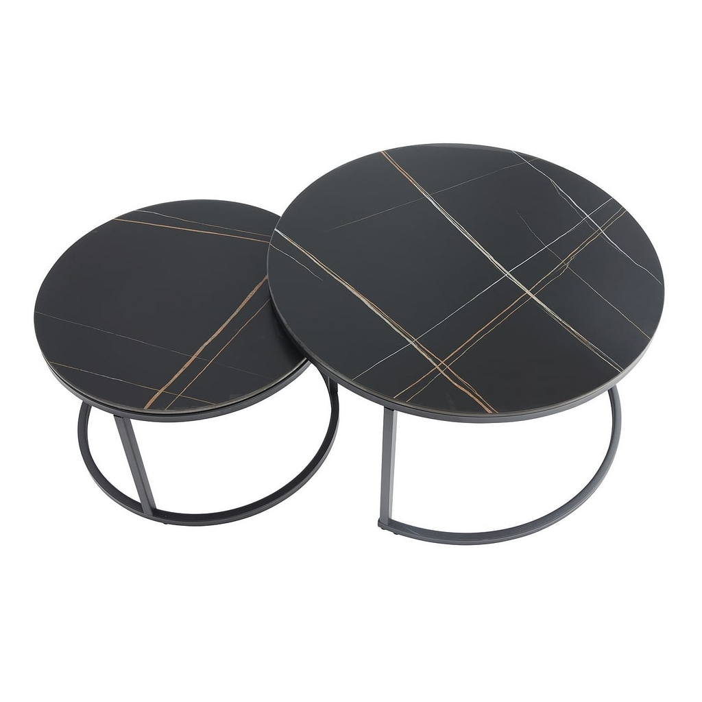 Oba stolky mají kruhovou desku z keramiky, kterou nese černá kovová podnož. U této varianty mají oba stolky černou žíhanou desku.