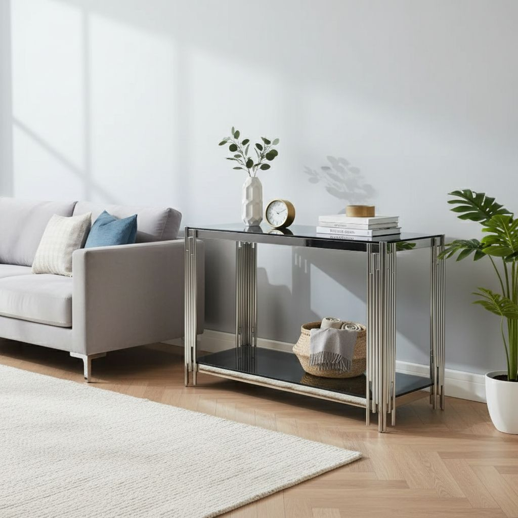 Vrchní deska stolu je vyrobená z tvrzeného skla s kouřovou úpravou. Skvěle tak ladí s pochromovanou kovovou podnoží.