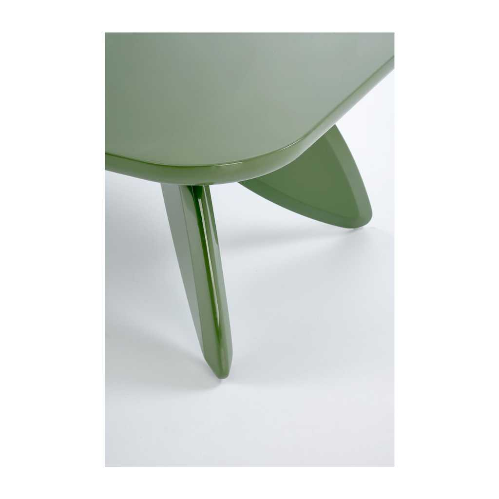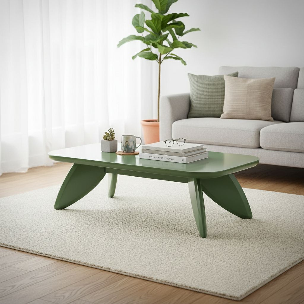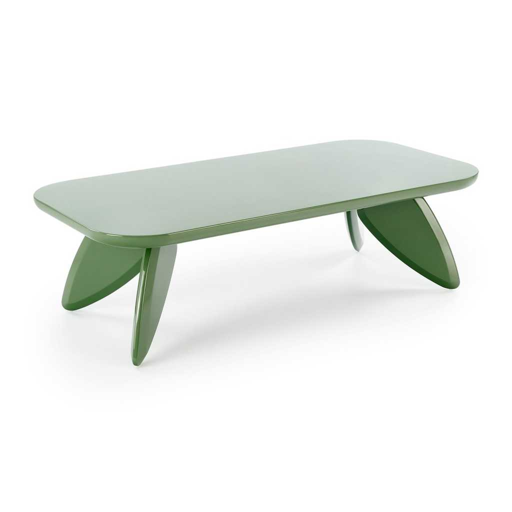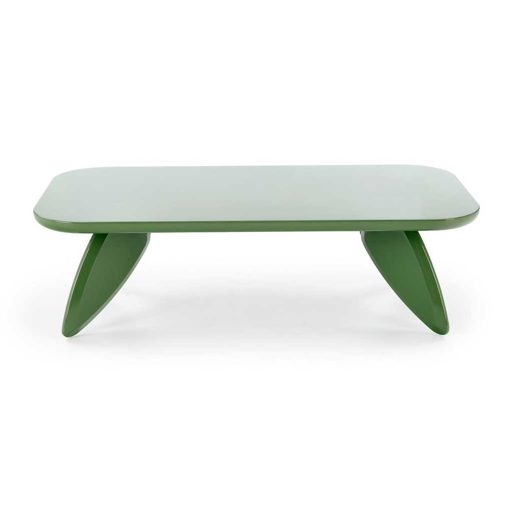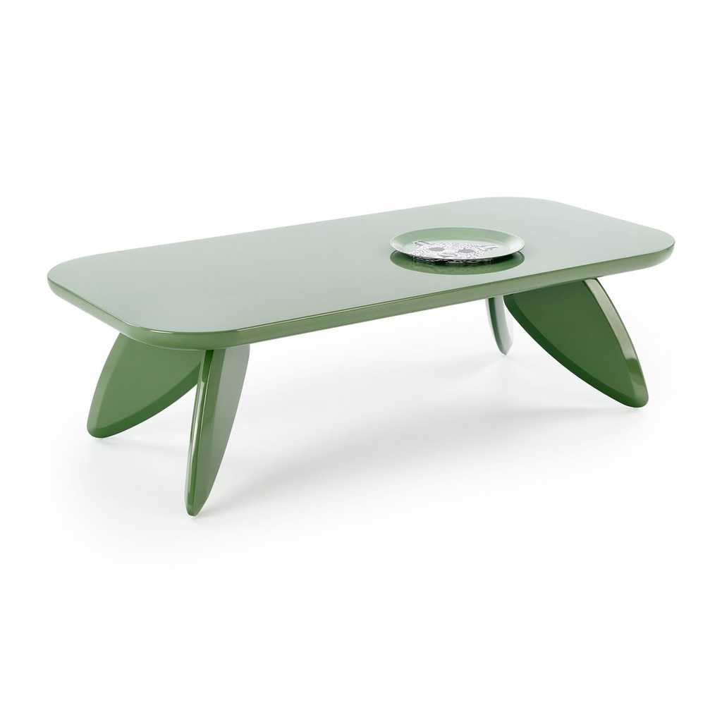 Stolek má obdélníkový tvar horní desky, která je dostatečně prostorná, a zajímavý design nohou, který působí moderně a zároveň robustně. Díky nízké výšce je vhodný pro pohodlné užívání v oblasti sedací soupravy.