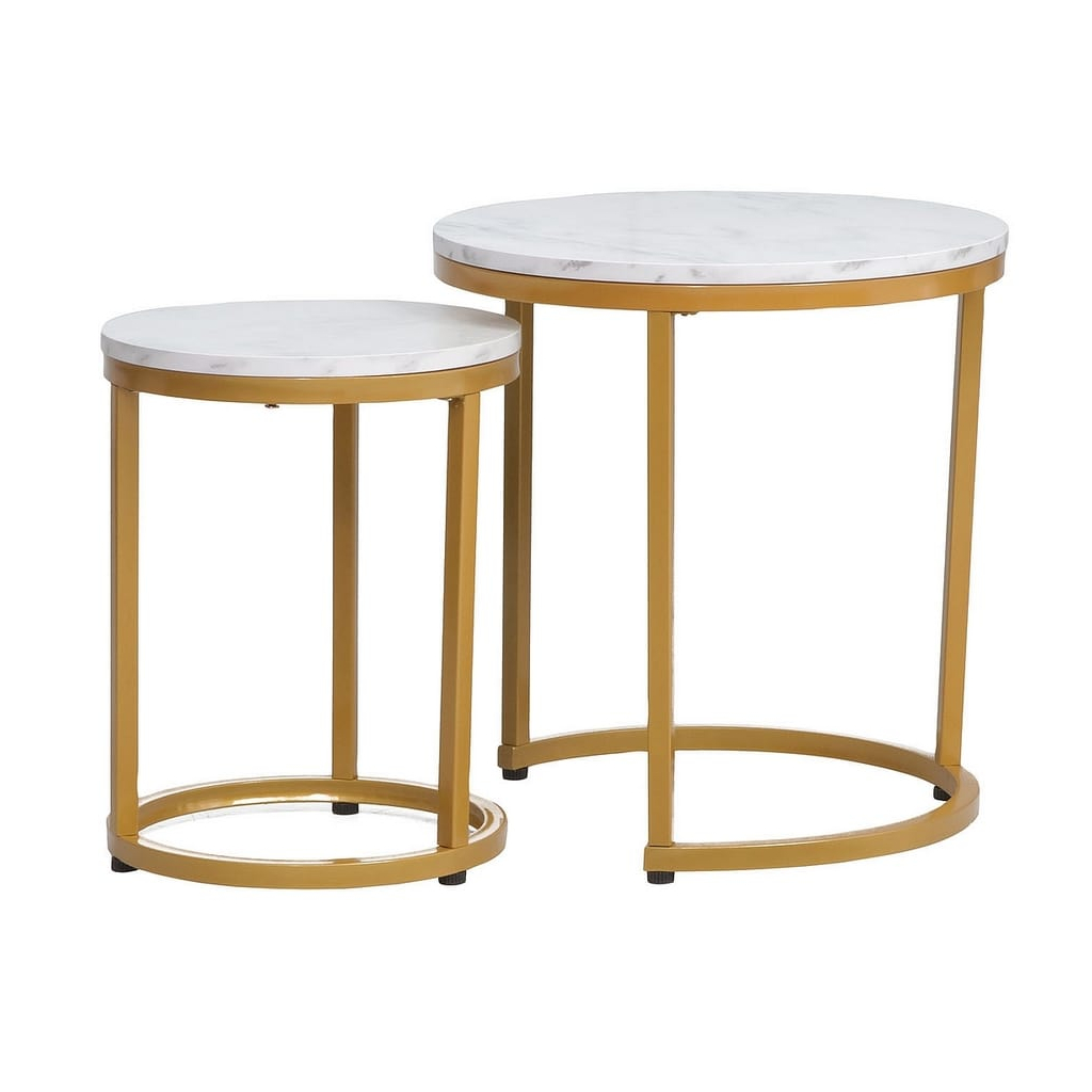 Oba stolky mají kruhovou desku z laminované dřevotřísky, kterou nese matně zlatá kovová podnož. Vybrat si můžete z několika barevných provedení.