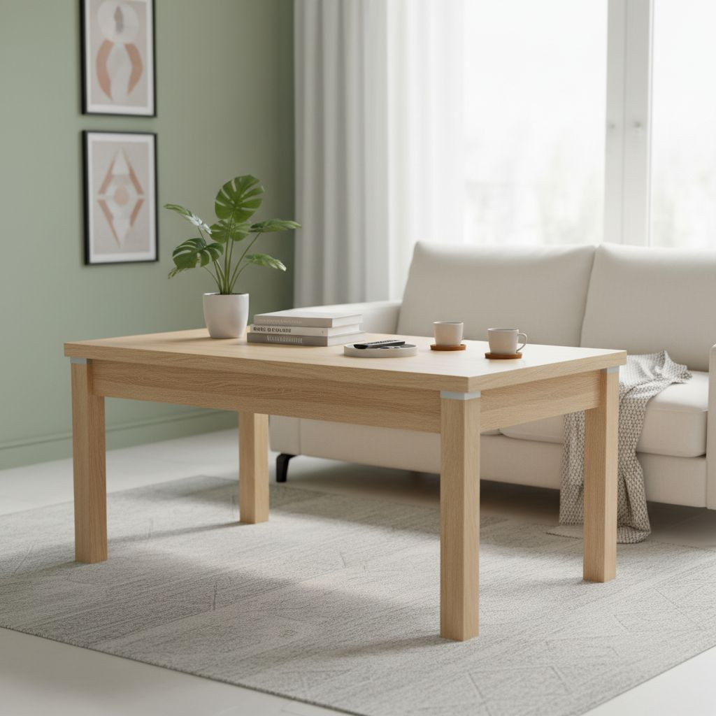 Konferenční stolek má tvar obdélníku a je vyroben z dřevovláknitých desek.