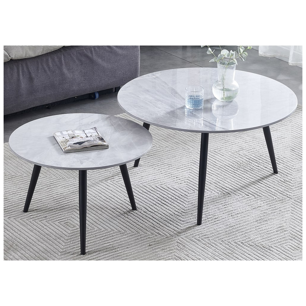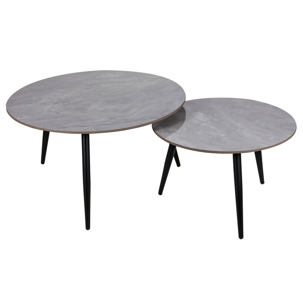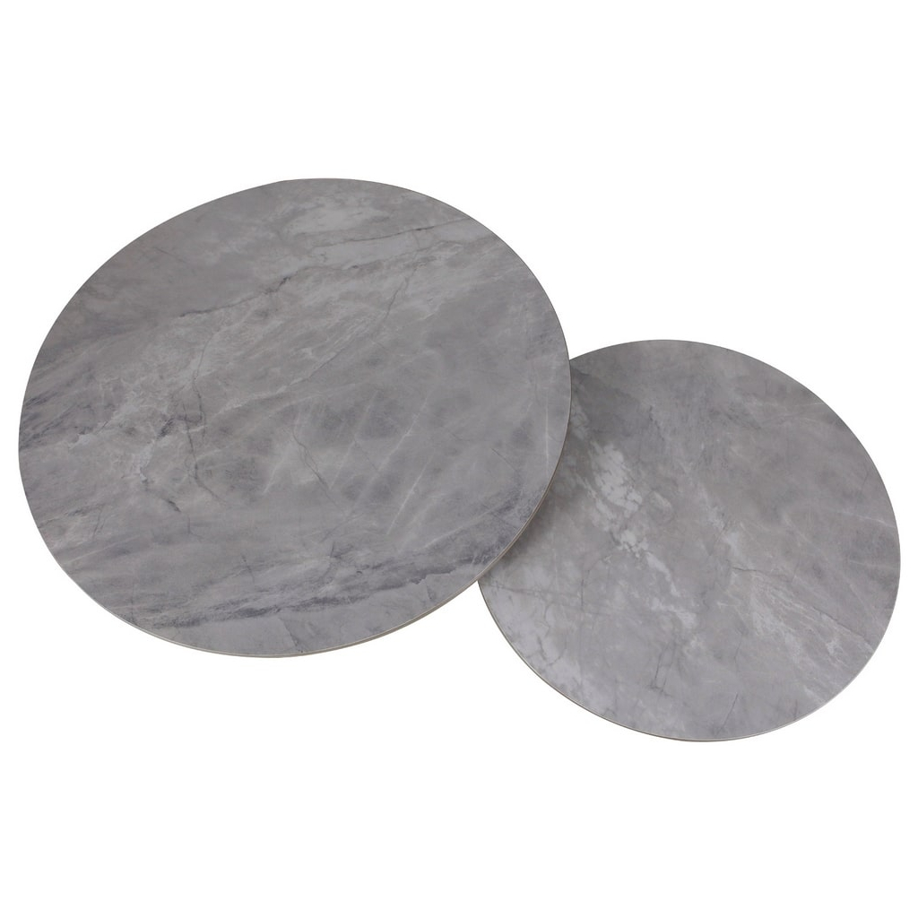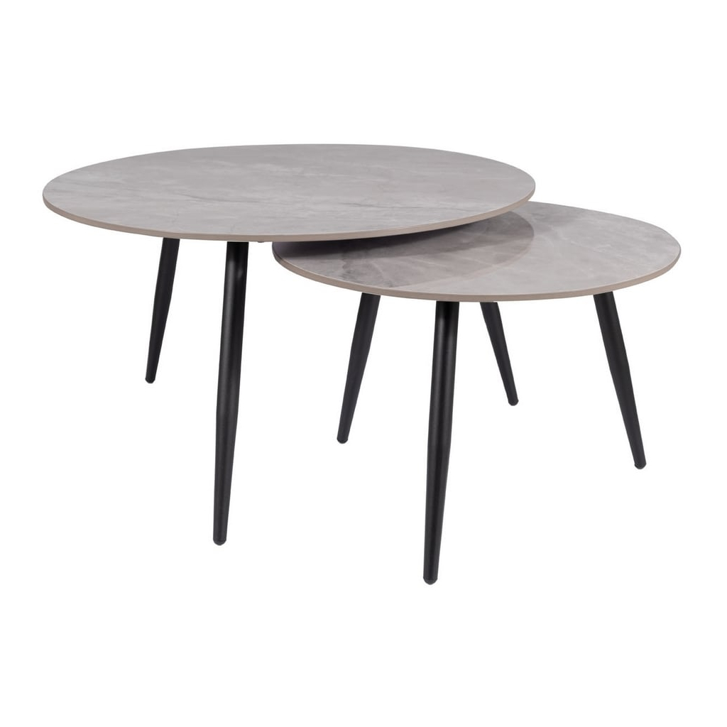 Oba stolky mají kruhovou desku z keramiky, kterou nesou černé kovové nohy. U této varianty mají oba stolky šedou desku s jemnou mramorovou texturou.