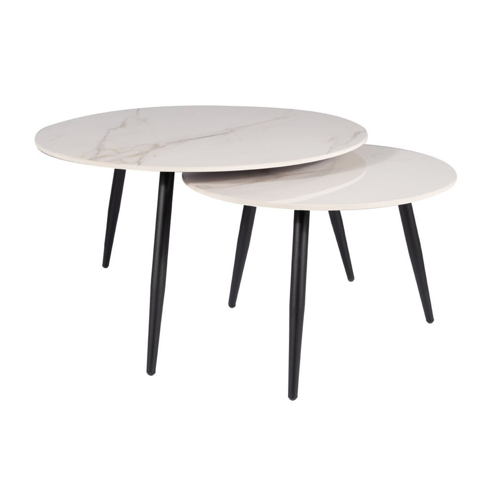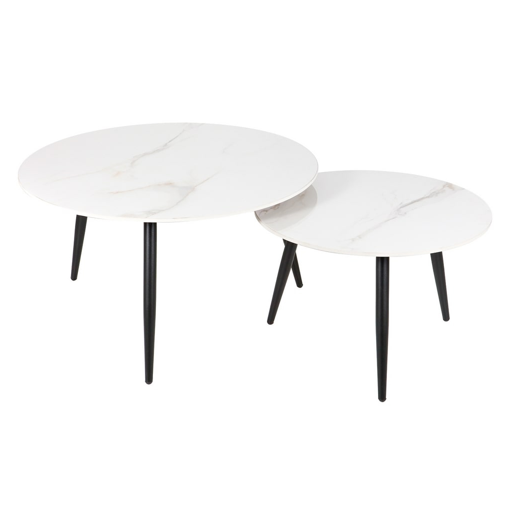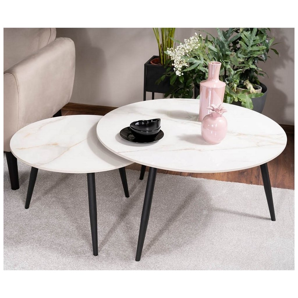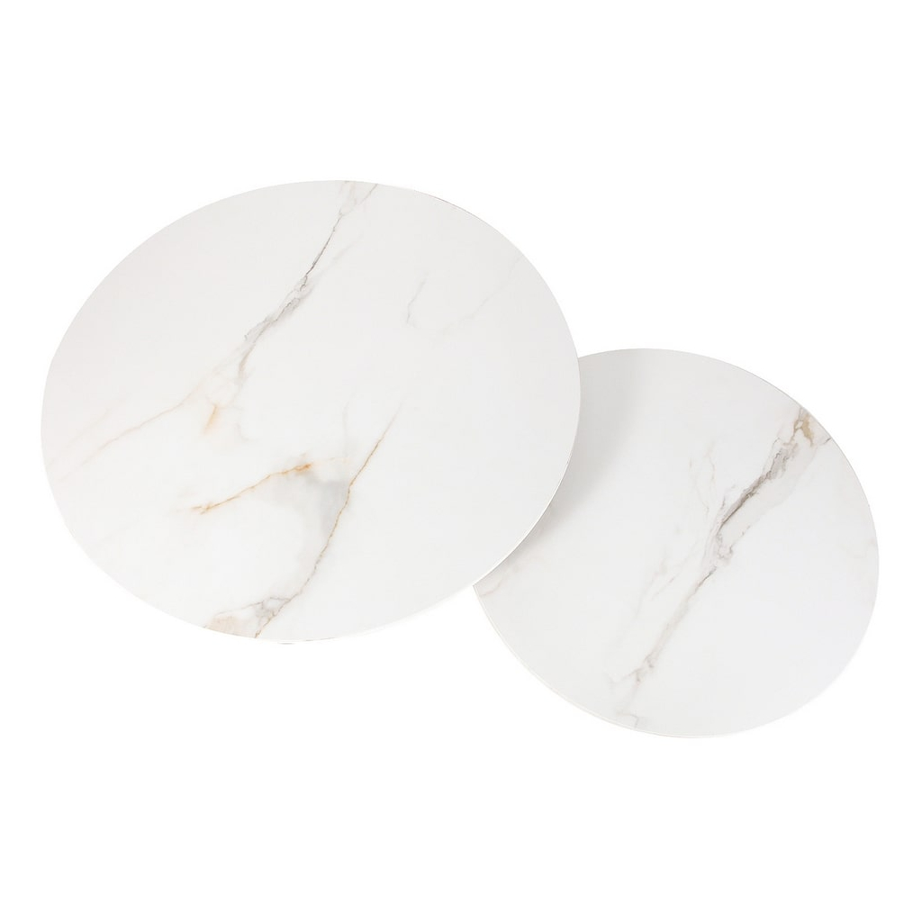 Oba stolky mají kruhovou desku z keramiky, kterou nesou černé kovové nohy. U této varianty mají oba stolky bílou desku s jemnou mramorovou texturou.