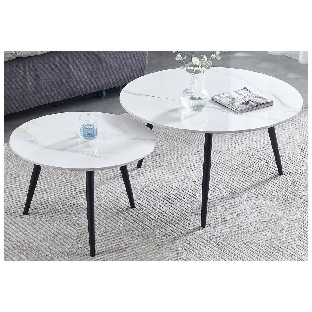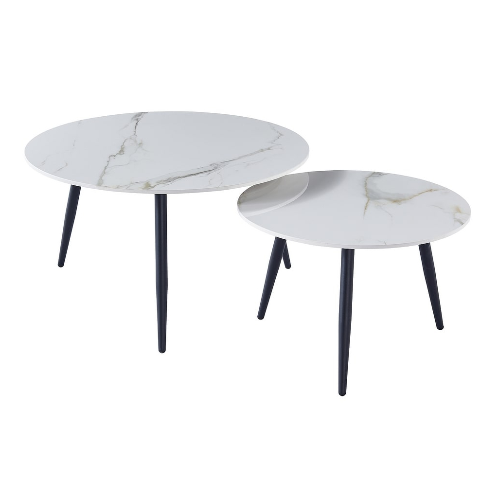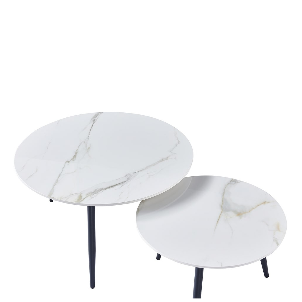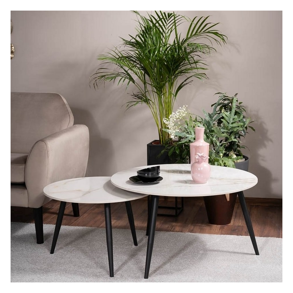 Oba stolky mají kruhovou desku z keramiky, kterou nesou černé kovové nohy. U této varianty mají oba stolky bílou desku s jemnou mramorovou texturou.