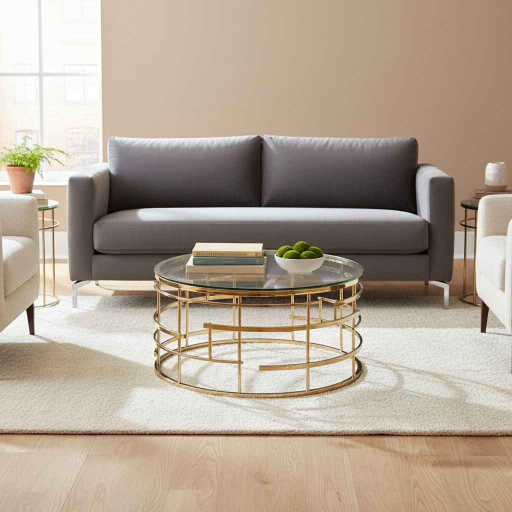 Dopřejte si trochu okázalosti – členitá konstrukce ze zlatého nerezu neunikne pozornosti žádného hosta, zejména pokud ji vhodně doplníte dalšími kusy nábytku. O funkčnost už se postará skromnější část stolku, a sice kruhová deska z průhledného tvrzeného skla.