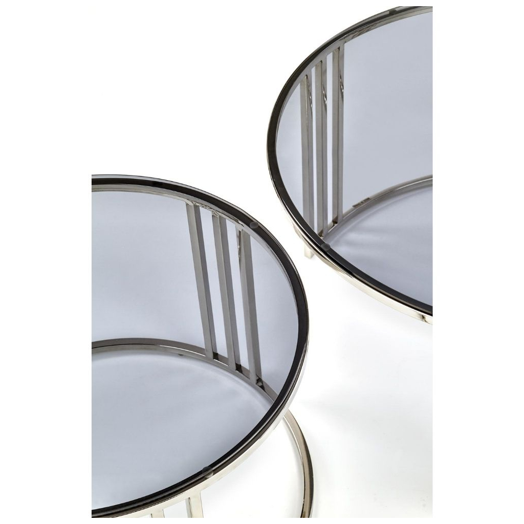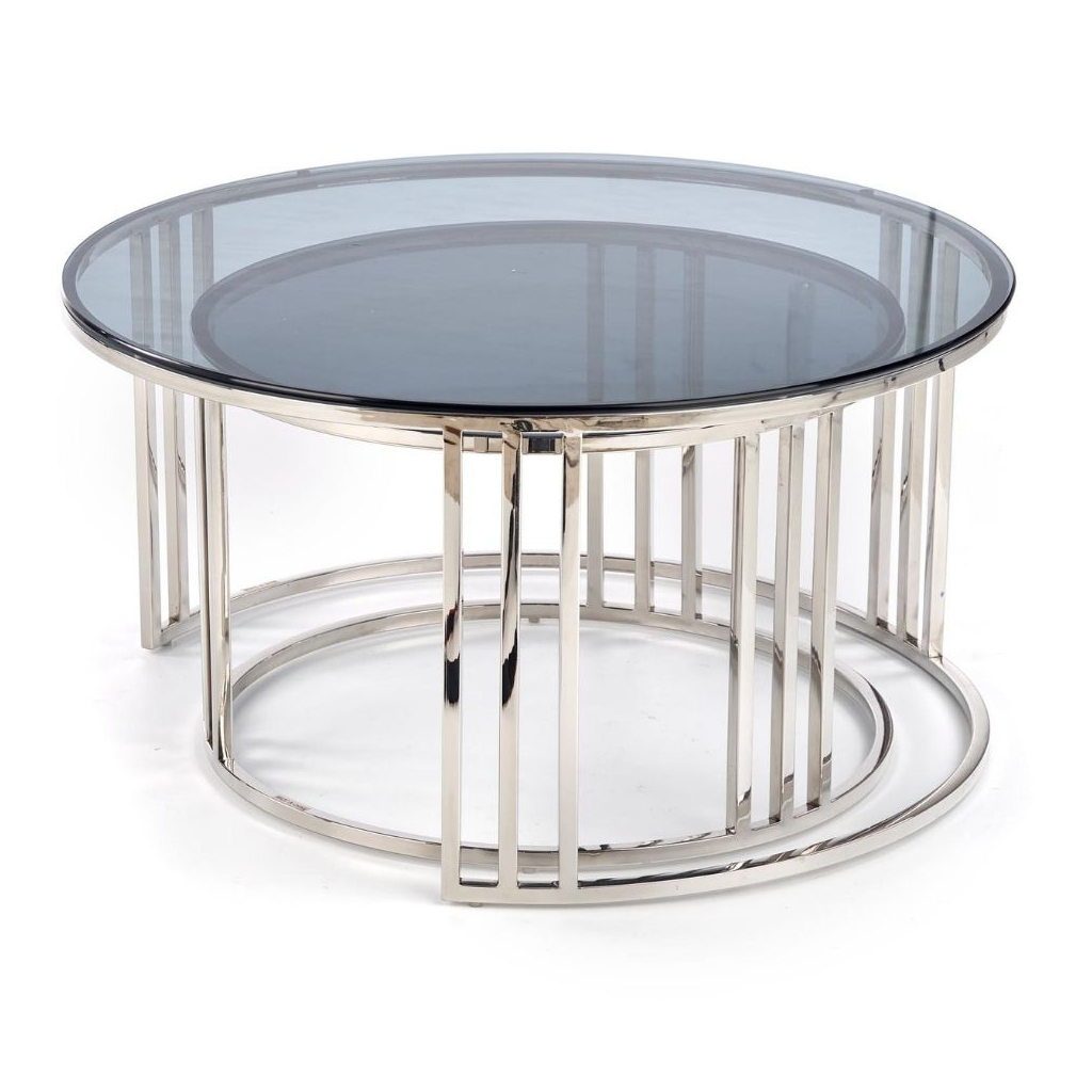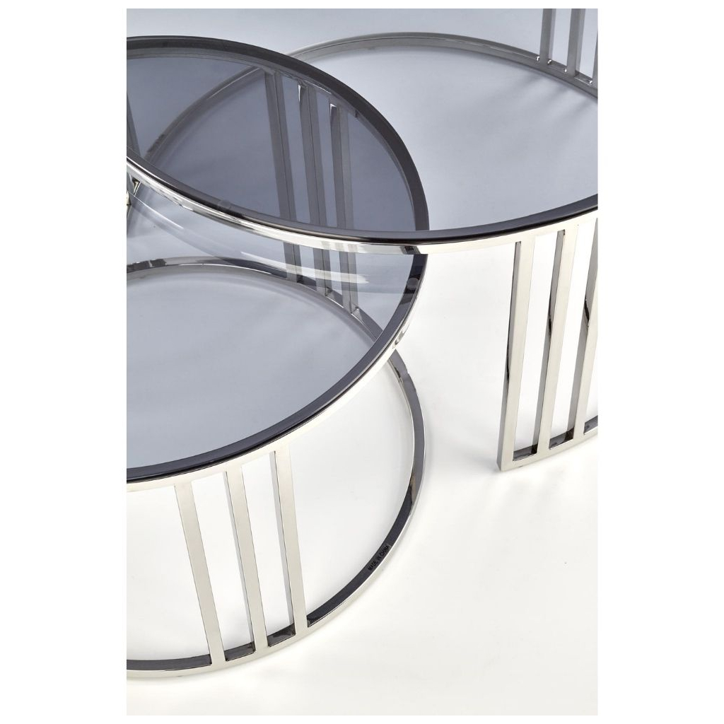 Horní deska je tvořena ze skla v šedém průhledném provedení, konstrukce stolků z chromované oceli v černé barvě. Nožky stolků jsou opatřeny ochranou proti poškození podlahy.